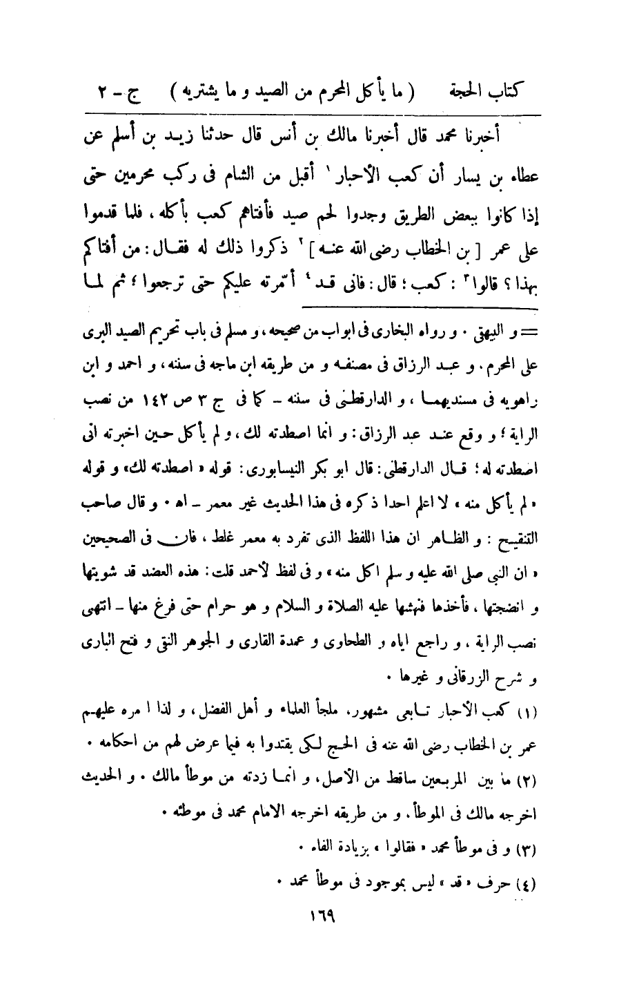 اُخْبُرْنَا مُحَمَّد قَالَ اُخْبُرْنَا مَالك بن انس قَالَ حَدثنَا زيد بن اسْلَمْ عَن عَطاء بن يسَار ان كَعْب الاحبار اقبل من الشَّام فِي ركب محرمين حَتَّى إِذا كَانُوا بِبَعْض الطَّرِيق وجدوا لحم صيد فأفتاهم كَعْب بِأَكْلِهِ فَلَمَّا قدمُوا على عمر بن الْخطاب رَضِي الله عَنهُ ذكرُوا ذَلِك لَهُ فَقَالَ من افتاكم بِهَذَا قَالُوا كَعْب قَالَ فَإِنِّي قد امرته عَلَيْكُم حَتَّى ترجعوا ثمَّ لما