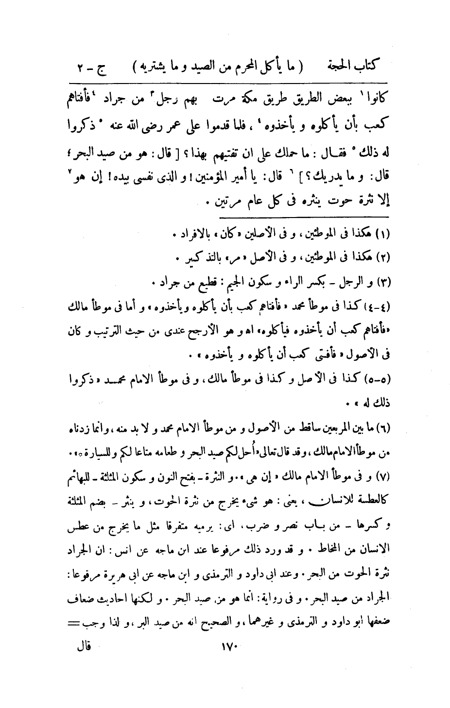 كَانُوا بِبَعْض الطَّرِيق طَرِيق مَكَّة مرت بهم رجل من جَراد فأفتاهم كَعْب بِأَن يأكلوه ويأخذوه فَلَمَّا قدمُوا على عمر رَضِي الله عَنهُ ذكرُوا لَهُ ذَلِك فَقَالَ مَا حملك على ان تفتيهم بِهَذَا قَالَ هُوَ من صيد الْبَحْر قَالَ وَمَا يدْريك قَالَ يَا امير الْمُؤمنِينَ وَالَّذِي نَفسِي بِيَدِهِ ان هُوَ الا نثرة حوت يَنْثُرهُ فِي كل عَام مرَّتَيْنِ