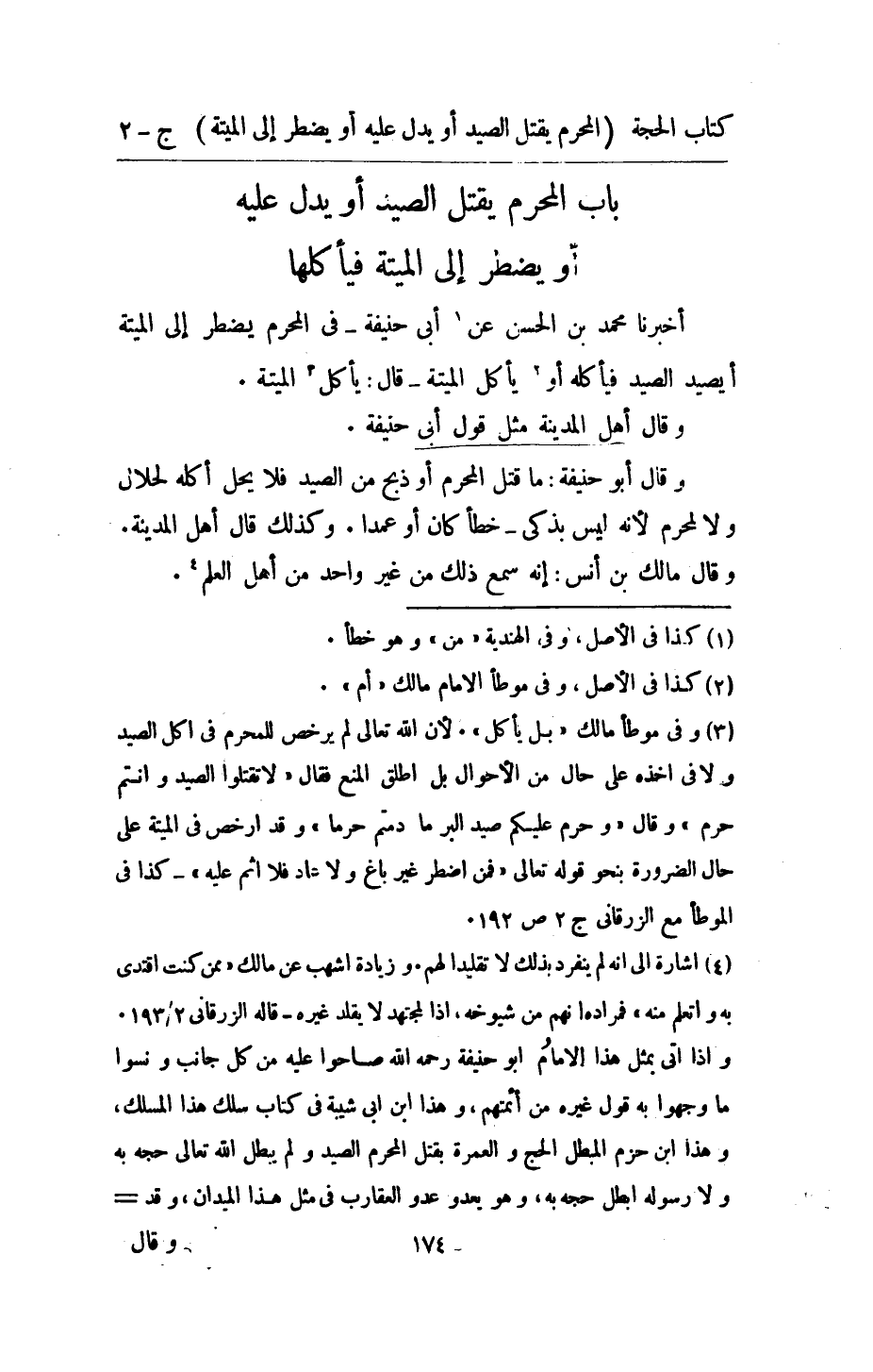 اُخْبُرْنَا مُحَمَّد بن الْحسن عَن أبي حنيفَة فِي الْمحرم يضْطَر الى الْميتَة أيصيد الصَّيْد فيأكله أَو يَأْكُل الْميتَة قَالَ يَأْكُل الْميتَة وَقَالَ أهل الْمَدِينَة مثل قَول أبي حنيفَة