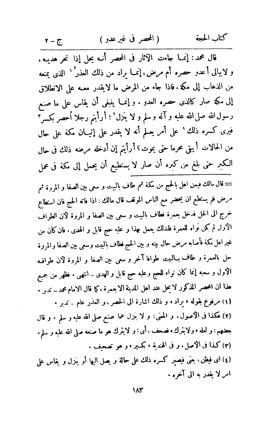 قَالَ مُحَمَّد إِنَّمَا جَاءَت الْآثَار فِي الْمحصر أَنه يحل إِذا نحر هَدْيه وَلَا يُبَالِي أعدو حصره أم مرض إِنَّمَا يُرَاد من ذَلِك الْعذر الَّذِي يمنعهُ من الذّهاب الى مَكَّة فَإِذا جَاءَ من الْمَرَض مَا لَا يقدر مَعَه على الانطلاق الى مَكَّة صَار كَالَّذي حصره الْعَدو وانما يَنْبَغِي ان يُقَاس على مَا صنع رَسُول الله صلى الله عَلَيْهِ وَسلم وَلَا ينزل ارأيتم رجلا احصر بِكَسْر فَيرى كَسره ذَلِك على أَمر يعلم انه لَا يقدر على إتْيَان مَكَّة على حَال من الْحَالَات ايبقى محرما حَتَّى يَمُوت ارأيتم ان ادخله مَرضه ذَلِك فِي حَال الْكبر حَتَّى بلغ من كبره ان صَار لَا يَسْتَطِيع ان يحمل إِلَى مَكَّة فِي محمل