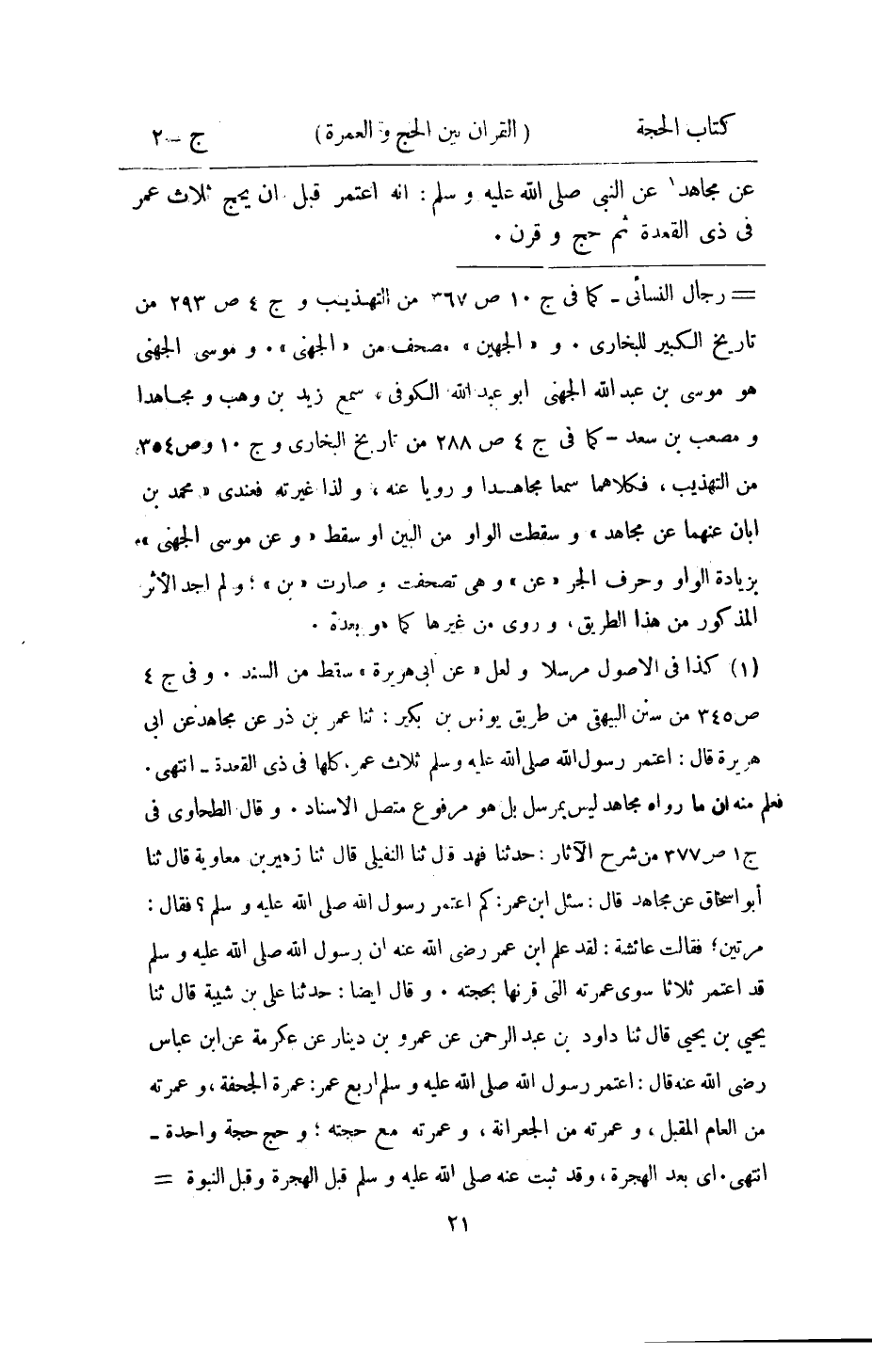 عَن مُجَاهِد عَن النَّبِي صلى الله عَلَيْهِ وَسلم أَنه اعْتَمر قبل أَن يحجّ ثَلَاث عمر فِي ذِي الْقعدَة ثمَّ حج وَقرن