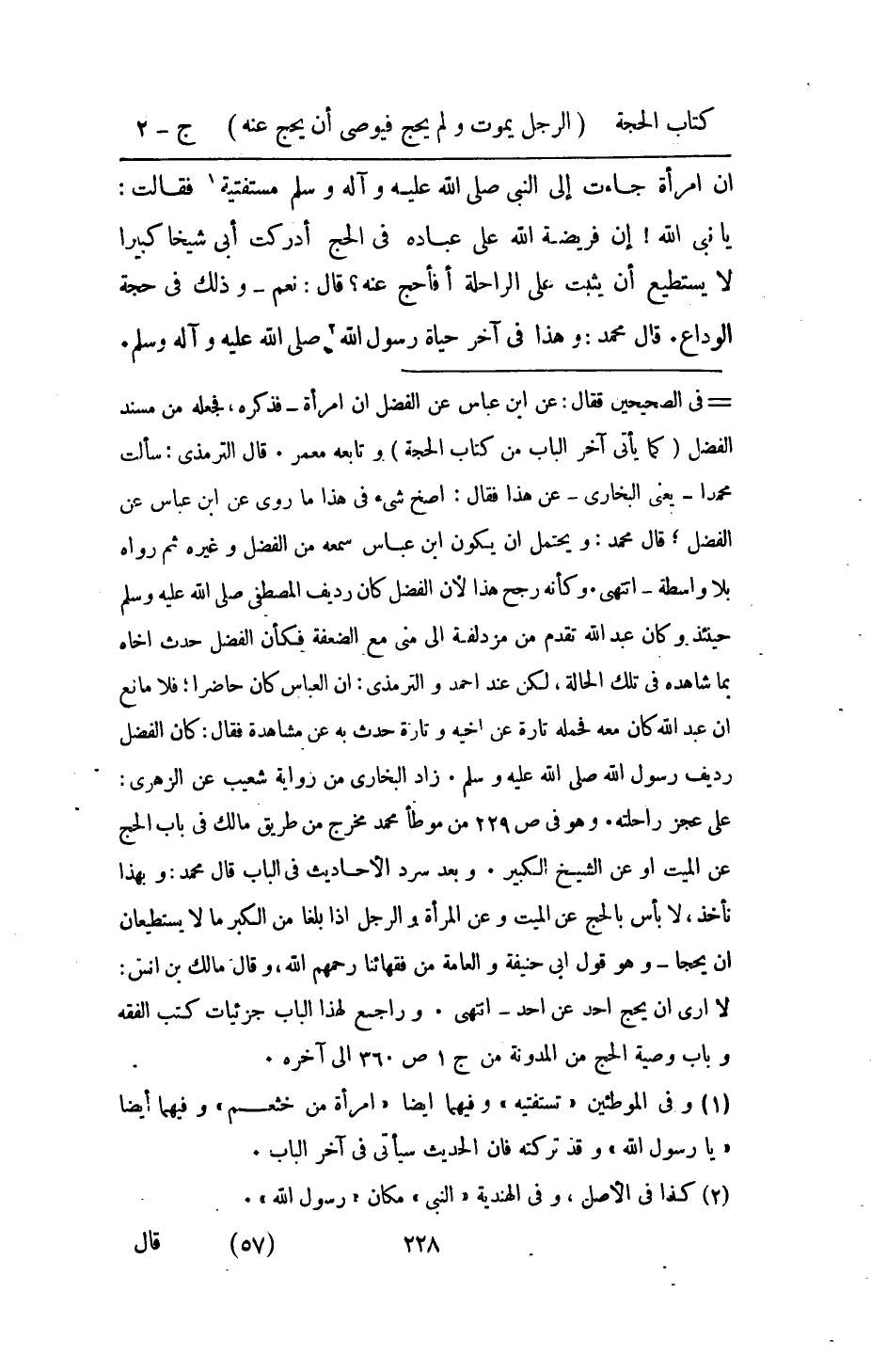 ان امْرَأَة جَاءَت الى النَّبِي صلى الله عَلَيْهِ وَسلم مستفتية فَقَالَت يَا نَبِي الله ان فَرِيضَة الله على عباده فِي الْحَج ادركت أبي شَيخا كَبِيرا لَا يَسْتَطِيع ان يثبت على الرَّاحِلَة أفأحج عَنهُ قَالَ نعم وَذَلِكَ فِي حجَّة الْوَدَاع قَالَ مُحَمَّد وَهَذَا فِي آخر حَيَاة رَسُول الله صلى الله عَلَيْهِ وَسلم