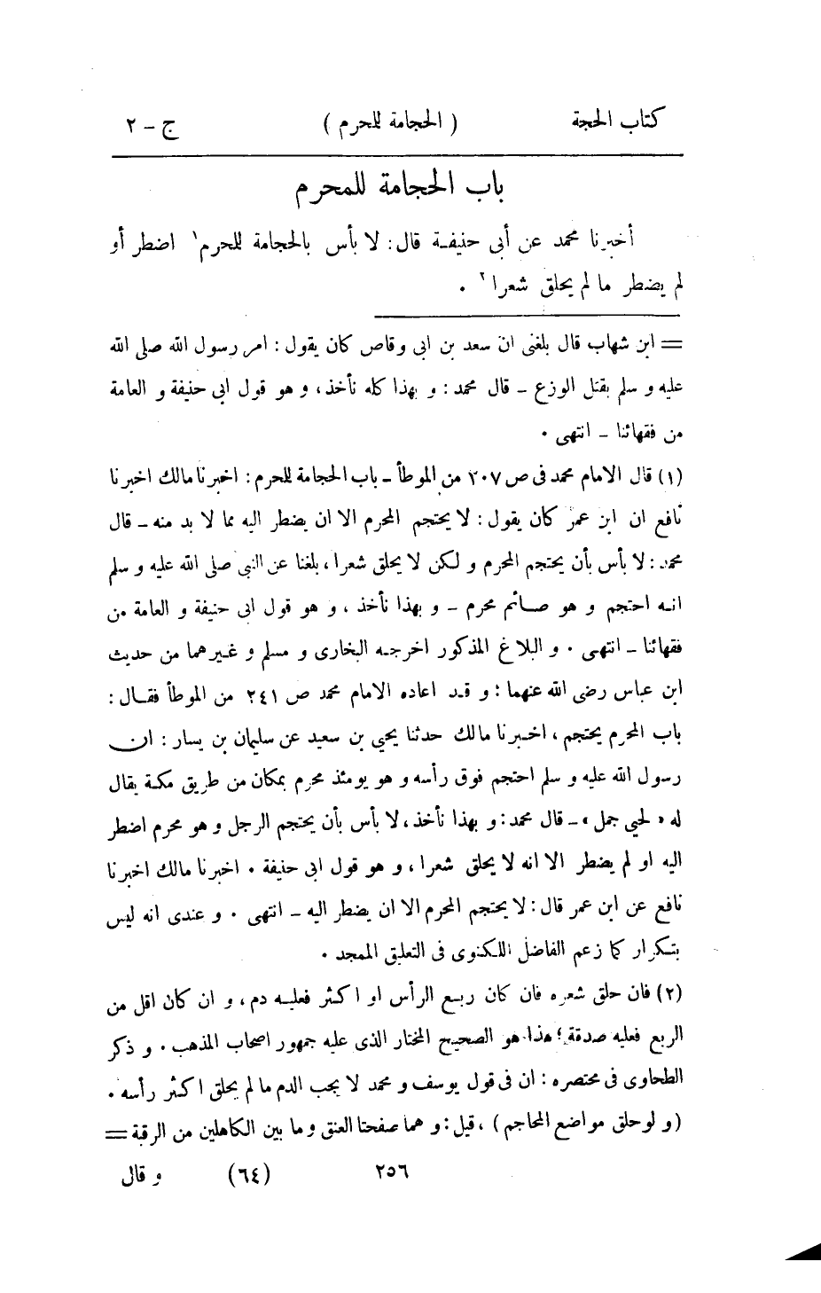 اُخْبُرْنَا مُحَمَّد عَن أبي حنيفَة قَالَ لَا بَأْس بالحجامة للْمحرمِ اضْطر أَو لم يضْطَر مَا لم يحلق شعرًا