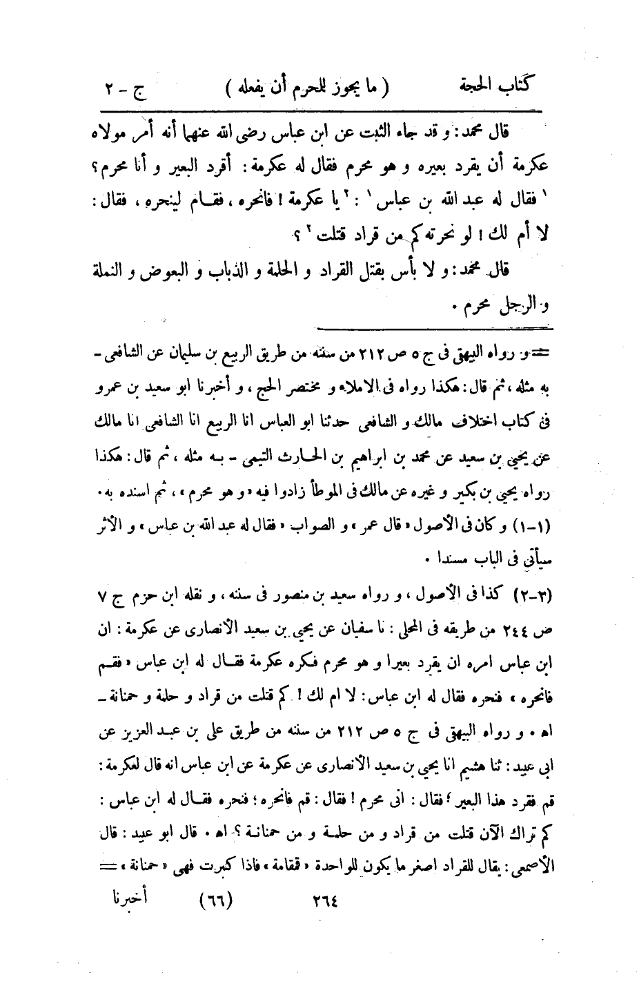 1 - قَالَ مُحَمَّد وَقد جَاءَ الثبت عَن ابْن عَبَّاس رَضِي الله عَنْهُمَا انه امْر مَوْلَاهُ عِكْرِمَهْ ان يقرد بعيره وَهُوَ محرم فَقَالَ لَهُ عِكْرِمَة اقرد الْبَعِير وانا محرم فَقَالَ لَهُ عبد الله بن عَبَّاس يَا عِكْرِمَة فانحره فَقَامَ لينحره فَقَالَ لَا ام لَك لَو نَحرته كم من قراد قتلت قَالَ مُحَمَّد وَلَا بَأْس بقتل القراد والحلمة والذباب والبعوض والنملة وَالرجل محرم