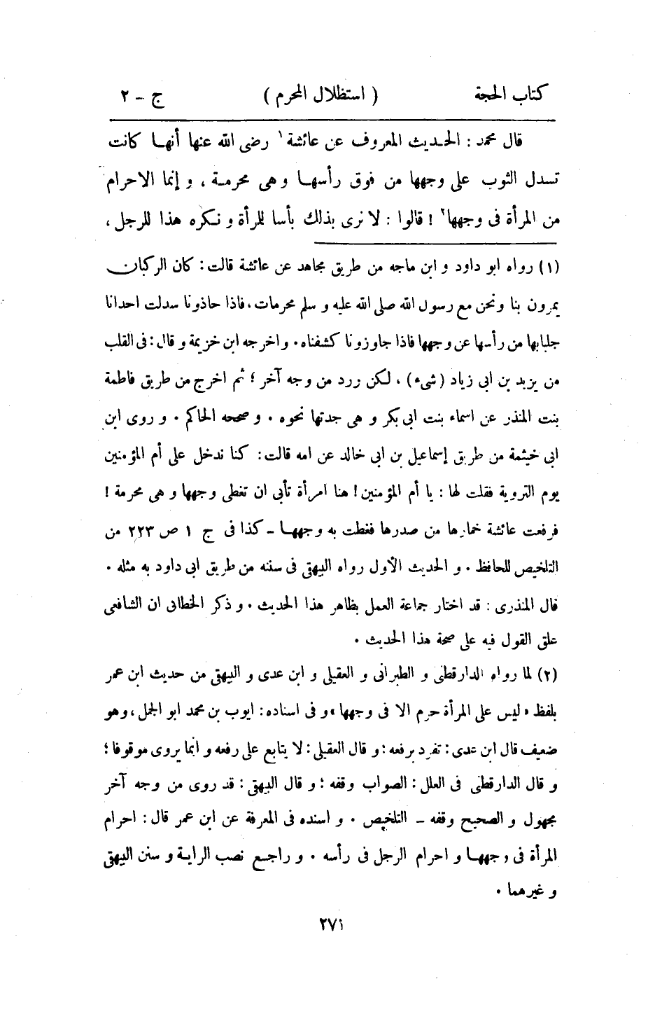 قَالَ مُحَمَّد الحَدِيث الْمَعْرُوف عَن عَائِشَة رَضِي الله عَنْهَا انها كَانَت تسدل الثَّوْب على وَجههَا من فَوق رَأسهَا وَهِي مُحرمَة وانما الاحرام من الْمَرْأَة فِي وَجههَا قَالُوا لَا نرى بذلك بَأْسا للْمَرْأَة ونكره هَذَا للرجل