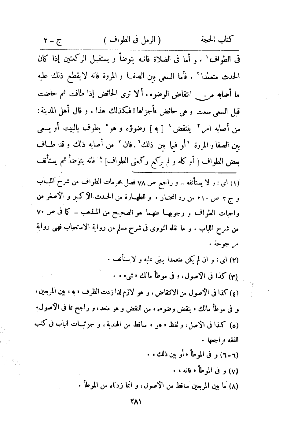 فِي الطّواف واما فِي الصَّلَاة فانه يتَوَضَّأ وَيسْتَقْبل الرَّكْعَتَيْنِ إِذا كَانَ الْحَدث مُتَعَمدا فاما السَّعْي بَين الصَّفَا والمروة فانه لَا يقطع ذَلِك عَلَيْهِ مَا اصابه من انْتِقَاض الْوضُوء الا ترى الْحَائِض إِذا طافت ثمَّ حَاضَت قبل السَّعْي سعت وَهِي حَائِض فأجزاها فَكَذَلِك هَذَا وَقَالَ أهل الْمَدِينَة من اصابه امْر ينْتَقض بِهِ وضوءه وَهُوَ يطوف بِالْبَيْتِ أَو يسْعَى بَين الصَّفَا والمروة أَو فِيمَا بَين ذَلِك فان من اصابه ذَلِك وَقد طَاف بعض الطّواف أَو كُله وَلم يرْكَع رَكْعَتي الطّواف فانه يتَوَضَّأ ثمَّ يسْتَأْنف