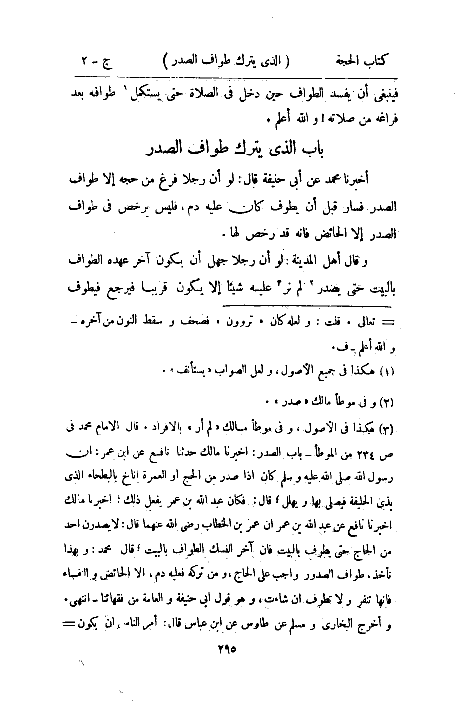 اُخْبُرْنَا مُحَمَّد عَن أبي حنيفَة قَالَ لَو ان رجلا فرغ من حجه الا طواف الصَّدْر فَسَار قبل ان يطوف كَانَ عَلَيْهِ دم فَلَيْسَ يرخص فِي طواف الصَّدْر الا الْحَائِض فانه قد رخص لَهَا وَقَالَ أهل الْمَدِينَة لَو ان رجلا جهل ان يكون اخر عَهده الطّواف بِالْبَيْتِ حَتَّى يصدر لم نر عَلَيْهِ شَيْئا الا يكون قَرِيبا فَيرجع فيطوف