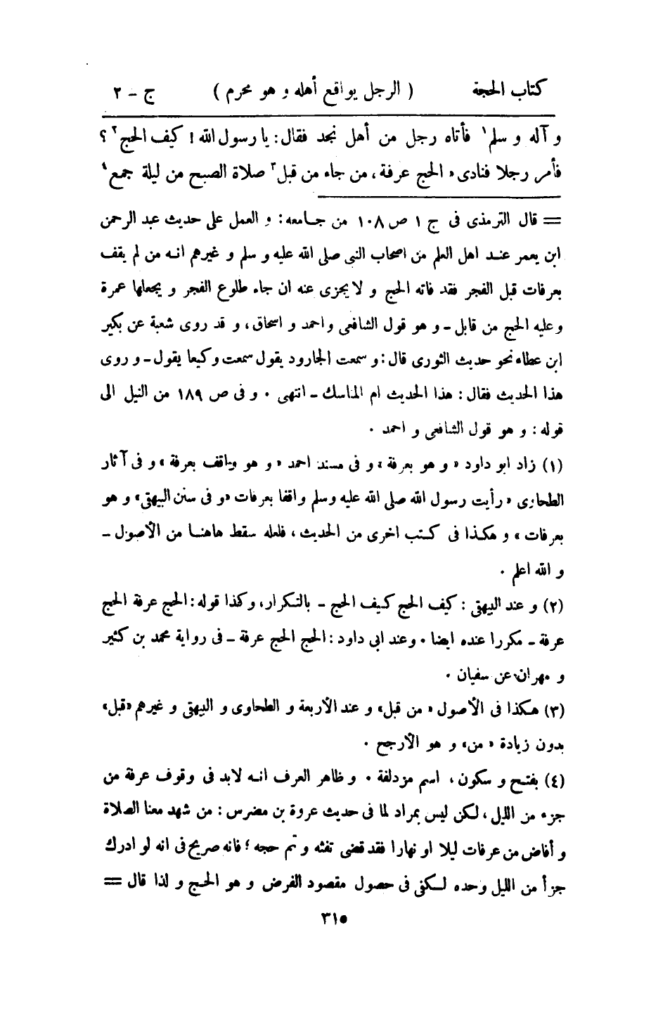 وَآله وَسلم فَأَتَاهُ رجل من أهل نجد فَقَالَ يَا رَسُول الله كَيفَ الْحَج فَأمر رجلا فَنَادَى الْحَج عَرَفَة من جَاءَ من قبل صَلَاة الصُّبْح من لَيْلَة جمع