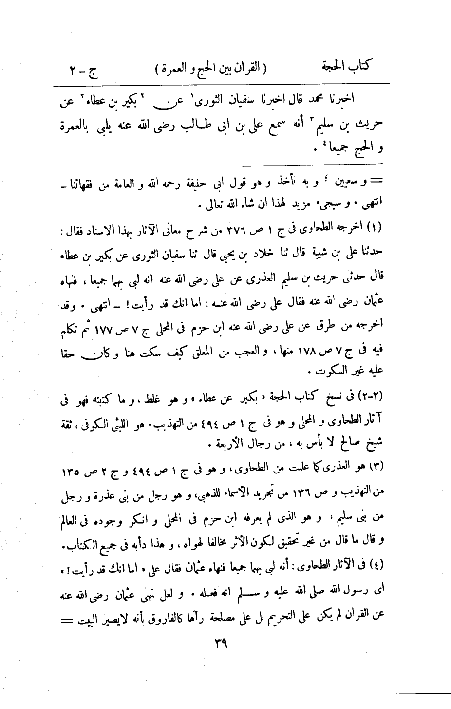 اُخْبُرْنَا مُحَمَّد قَالَ اُخْبُرْنَا سُفْيَان الثَّوْريّ عَن بكير بن عَطاء عَن حُرَيْث بن سليم انه سمع عَليّ بن أبي طَالب رَضِي الله عَنهُ يُلَبِّي بِالْعُمْرَةِ وَالْحج جَمِيعًا