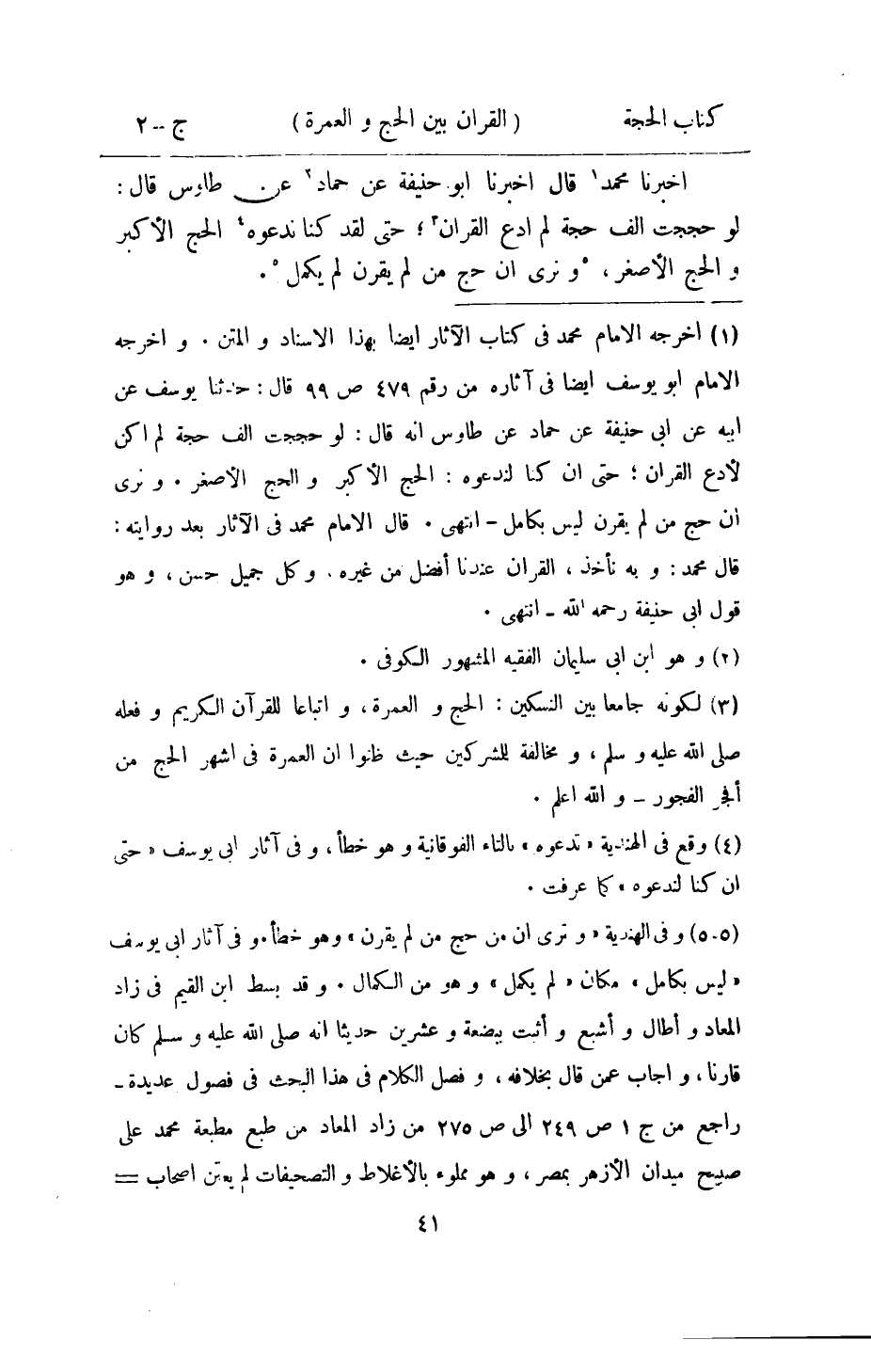 اُخْبُرْنَا مُحَمَّد قَالَ اُخْبُرْنَا أَبُو حنيفَة عَن حَمَّاد عَن طَاوس قَالَ لَو حججْت الف حجَّة لم ادْع الْقرَان حَتَّى لقد كُنَّا نَدْعُوهُ الْحَج الْأَكْبَر وَالْحج الْأَصْغَر ونرى ان حج من لم يقرن لم يكمل