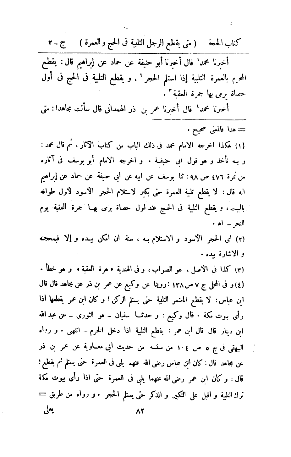 أخبرنَا مُحَمَّد قَالَ أخبرنَا أَبُو حنيفَة عَن حَمَّاد عَن ابراهيم قَالَ يقطع الْمحرم بِالْعُمْرَةِ التَّلْبِيَة إِذا اسْتَلم الْحجر وَيقطع التَّلْبِيَة فِي الْحَج فِي أول حَصَاة يَرْمِي بهَا جَمْرَة الْعقبَة