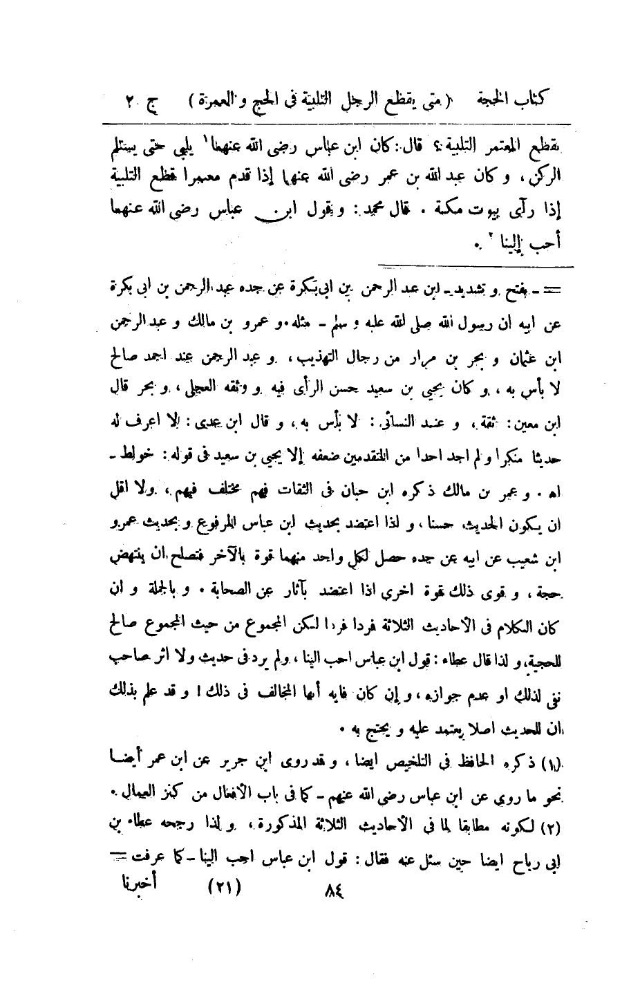 يقطع الْمُعْتَمِر التَّلْبِيَة قَالَ كَانَ ابْن عَبَّاس رَضِي الله عَنْهُمَا يُلَبِّي حَتَّى يسلتم الرُّكْن وَكَانَ عبد الله بن عمر رَضِي الله عَنْهُمَا إِذا قدم مُعْتَمِرًا قطع التَّلْبِيَة إِذا رأى بيُوت مَكَّة قَالَ مُحَمَّد وَقَول ابْن عَبَّاس رَضِي الله عَنْهُمَا احب إِلَيْنَا