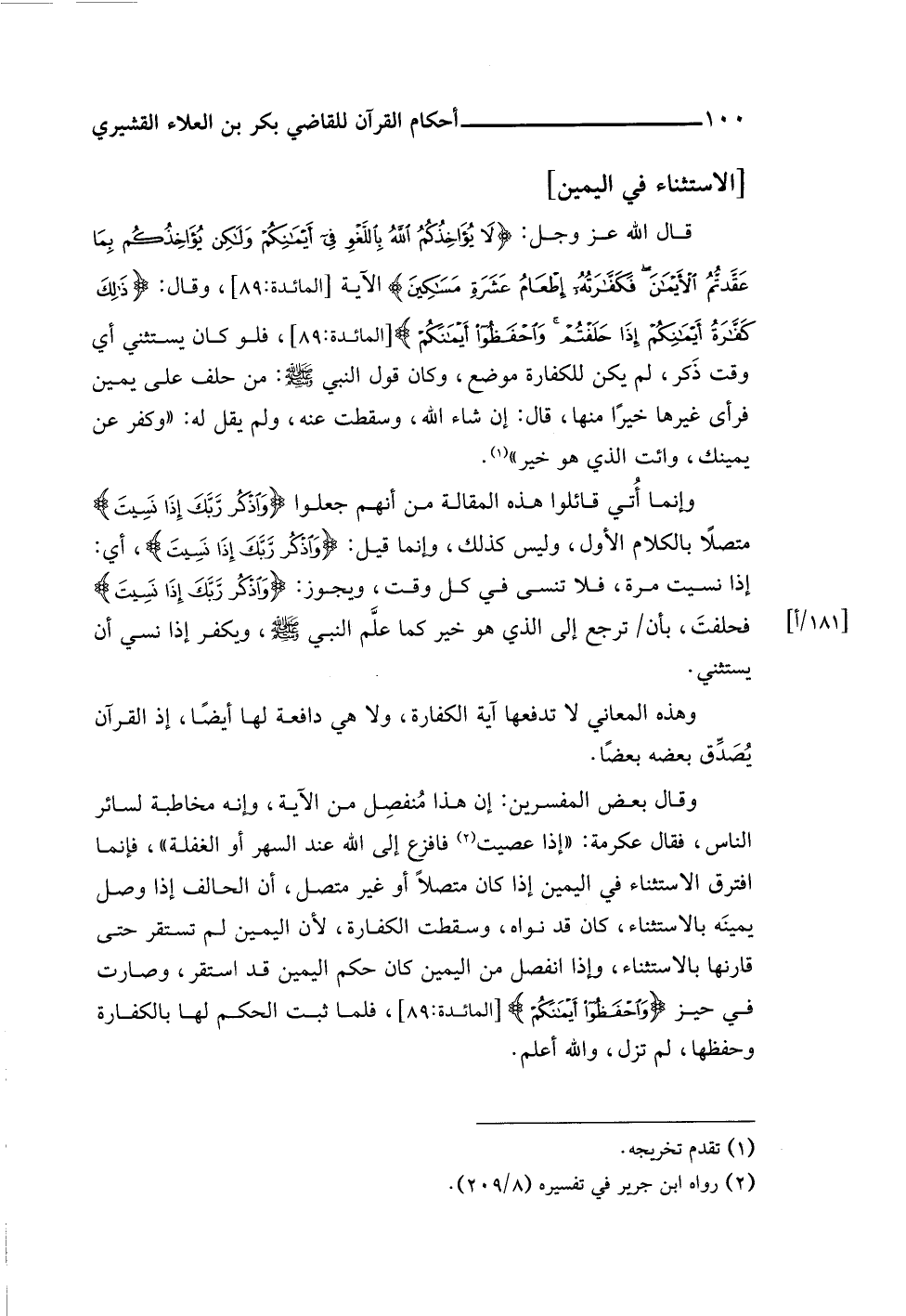 قال اللَّه عز وجل: {لَا يُؤَاخِذُكُمُ اللَّهُ بِاللَّغْوِ فِي أَيْمَانِكُمْ وَلَكِنْ يُؤَاخِذُكُمْ بِمَا عَقَّدْتُمُ الْأَيْمَانَ فَكَفَّارَتُهُ إِطْعَامُ عَشَرَةِ مَسَاكِينَ} الآية [المائدة: ٨٩]، وقال: {ذَلِكَ كَفَّارَةُ أَيْمَانِكُمْ إِذَا حَلَفْتُمْ وَاحْفَظُوا أَيْمَانَكُم} [المائدة: ٨٩]، فلو كان يستثني أي وقت ذَكر، لم يكن للكفارة موضع، وكان قول النبي -صلى اللَّه عليه وسلم-: من حلف على يمين فرأى غيرها خيرًا منها، قال: إن شاء اللَّه، وسقطت عنه، ولم يقل له: "وكفر عن يمينك، وائت الذي هو خير" (¬١).