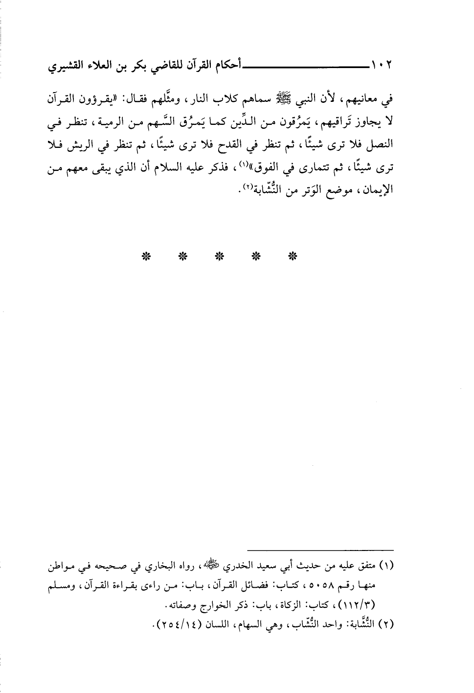 في معانيهم، لأن النبي -صلى اللَّه عليه وسلم- سماهم كلاب النار، ومثَّلهم فقال: "يقرؤون القرآن لا يجاوز تَراقيهم، يَمرُقون من الدِّين كما يَمرُق السَّهم من الرمية، تنظر في النصل فلا ترى شيئًا، ثم تنظر في القدح فلا ترى شيئًا، ثم تنظر في الريش فلا ترى شيئًا، ثم تتمارى في الفوق" (¬١)، فذكر عليه السلام أن الذي يبقى معهم من الإيمان، موضع الوَتر من النُّشّابة (¬٢).