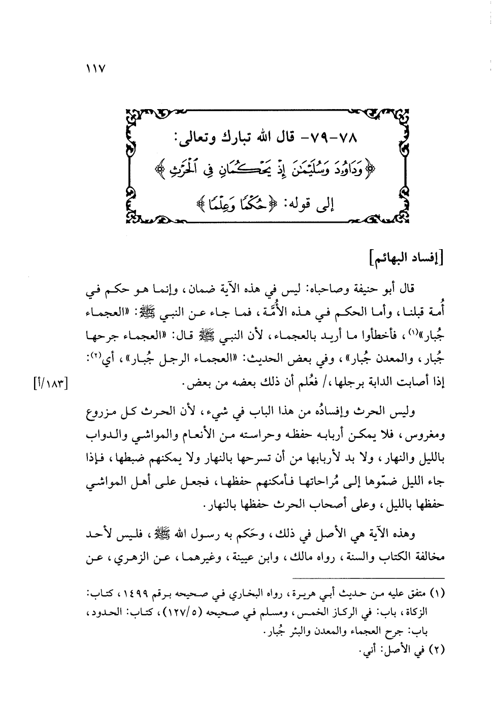 قال أبو حنيفة وصاحباه: ليس في هذه الآية ضمان، وإنما هو حكم في أُمة قبلنا، وأما الحكم في هذه الأُمَّة، فما جاء عن النبي -صلى اللَّه عليه وسلم-: "العجماء جُبار" (¬١)، فأخطأوا ما أريد بالعجماء، لأن النبي -صلى اللَّه عليه وسلم- قال: "العجماء جرحها جُبار، والمعدن جُبار"، وفي بعض الحديث: "العجماء الرجل جُبار"، أي (¬٢): إذا أصابت الدابة برجلها، فعُلم أن ذلك بعضه من بعض.