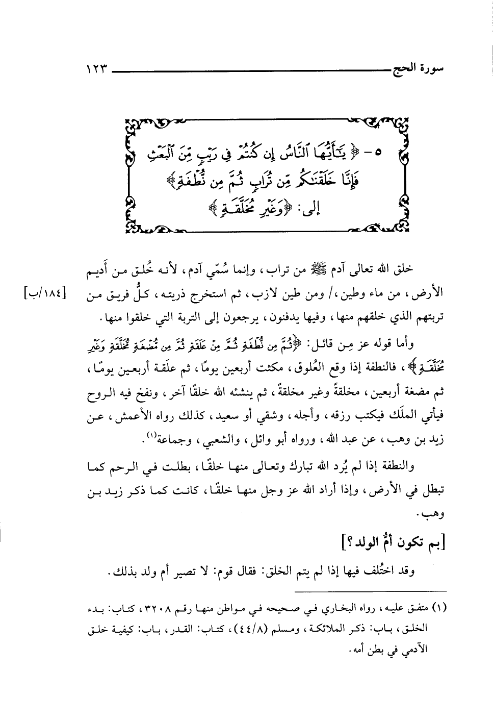 ٥ - {يَاأَيُّهَا النَّاسُ إِنْ كُنْتُمْ فِي رَيْبٍ مِنَ الْبَعْثِ فَإِنَّا خَلَقْنَاكُمْ مِنْ تُرَابٍ ثُمَّ مِنْ نُطْفَةٍ} إلى: {وَغَيْرِ مُخَلَّقَةٍ}