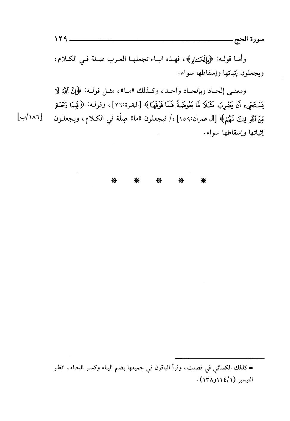 ومعنى إلحاد وبإلحاد واحد، وكذلك "ما"، مثل قوله: {إِنَّ اللَّهَ لَا يَسْتَحْيِي أَنْ يَضْرِبَ مَثَلًا مَا بَعُوضَةً فَمَا فَوْقَهَا} [البقرة: ٢٦]، وقوله: {فَبِمَا رَحْمَةٍ مِنَ اللَّهِ لِنْتَ لَهُمْ} [آل عمران: ١٥٩]، فيجعلون "ما" صِلَة في الكلام، ويجعلون إثباتها وإسقاطها سواء.
