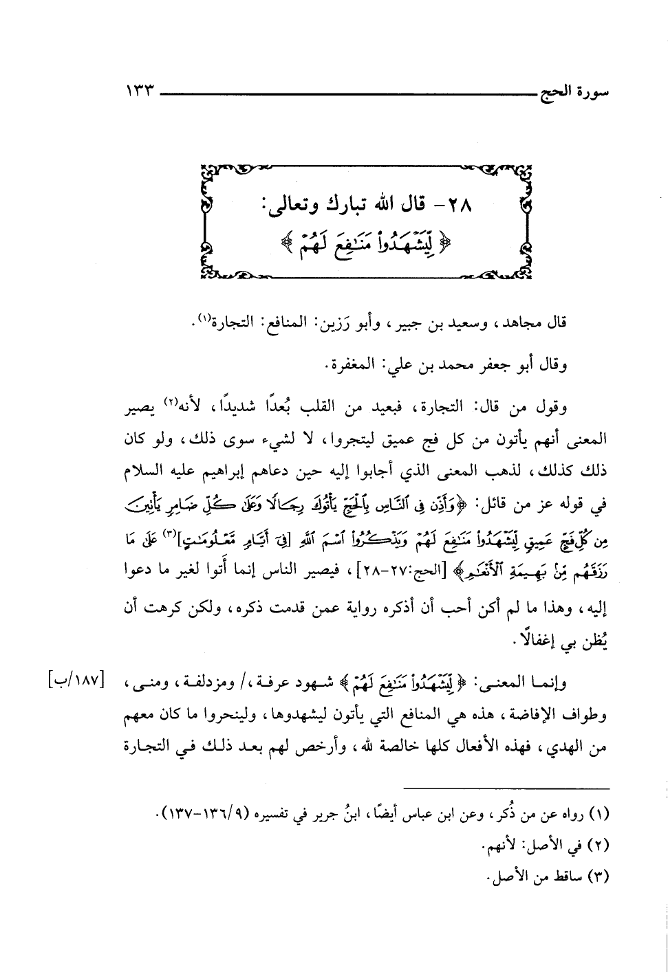وقول من قال: التجارة، فبعيد من القلب بُعدًا شديدًا، لأنه (¬٢) يصير المعنى أنهم يأتون من كل فج عميق ليتجروا، لا لشيء سوى ذلك، ولو كان ذلك كذلك، لذهب المعنى الذي أجابوا إليه حين دعاهم إبراهيم عليه السلام في قوله عز من قائل: {وَأَذِّنْ فِي النَّاسِ بِالْحَجِّ يَأْتُوكَ رِجَالًا وَعَلَى كُلِّ ضَامِرٍ يَأْتِينَ مِنْ كُلِّ فَجٍّ عَمِيقٍ (٢٧) لِيَشْهَدُوا مَنَافِعَ لَهُمْ وَيَذْكُرُوا اسْمَ اللَّهِ [فِي أَيَّامٍ مَعْلُومَاتٍ] (¬٣) عَلَى مَا رَزَقَهُمْ مِنْ بَهِيمَةِ الْأَنْعَامِ} [الحج: ٢٧ - ٢٨]، فيصير الناس إنما أَتوا لغير ما دعوا إليه، وهذا ما لم أكن أحب أن أذكره رواية عمن قدمت ذكره، ولكن كرهت أن يُظن بي إغفالًا.