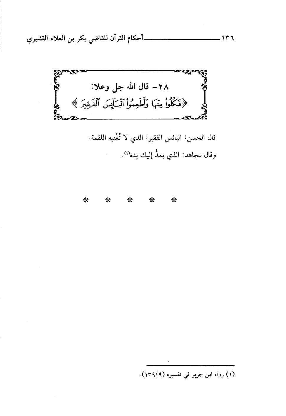 ٢٨ - قال اللَّه جل وعلا: {فَكُلُوا مِنْهَا وَأَطْعِمُوا الْبَائِسَ الْفَقِيرَ}