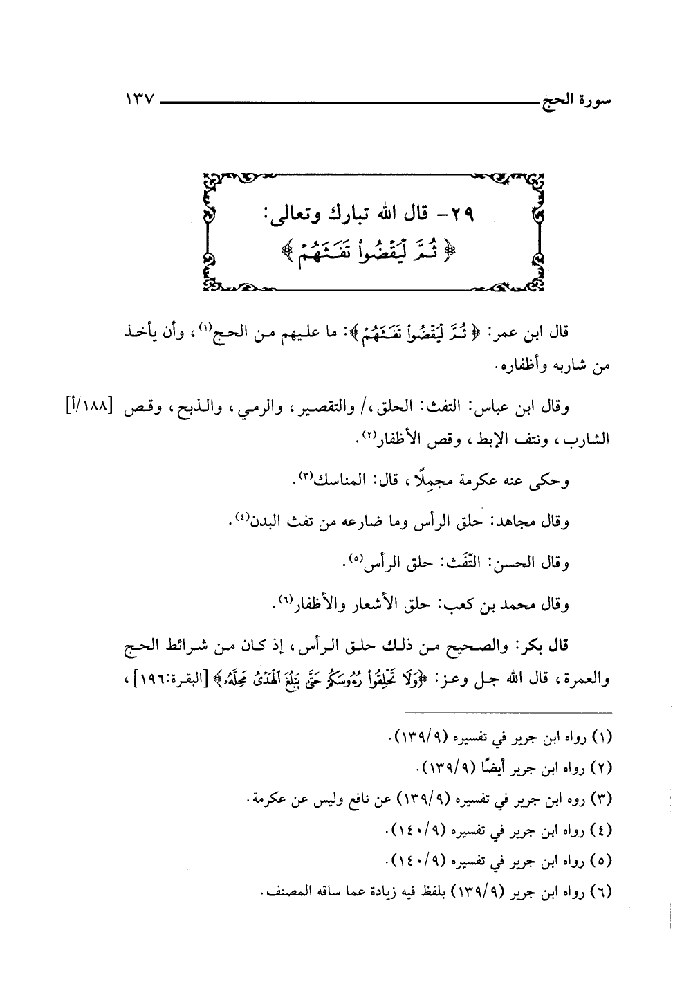 قال بكر: والصحيح من ذلك حلق الرأس، إذ كان من شرائط الحج والعمرة، قال اللَّه جل وعز: {وَلَا تَحْلِقُوا رُءُوسَكُمْ حَتَّى يَبْلُغَ الْهَدْيُ مَحِلَّهُ} [البقرة: ١٩٦]،