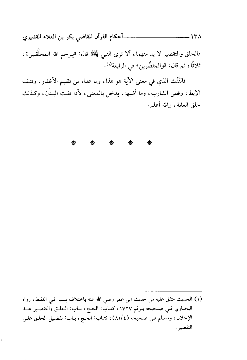 (¬١) الحديث متفق عليه من حديث ابن عمر رضي اللَّه عنه باختلاف يسير في اللفظ، رواه البخاري في صحيحه برقم ١٧٢٧، كتاب: الحج، باب الحلق والتقصير عند الإحلال، ومسلم في صحيحه (٤/ ٨١)، كتاب: الحج، باب: تفضيل الحلق على التقصير.
