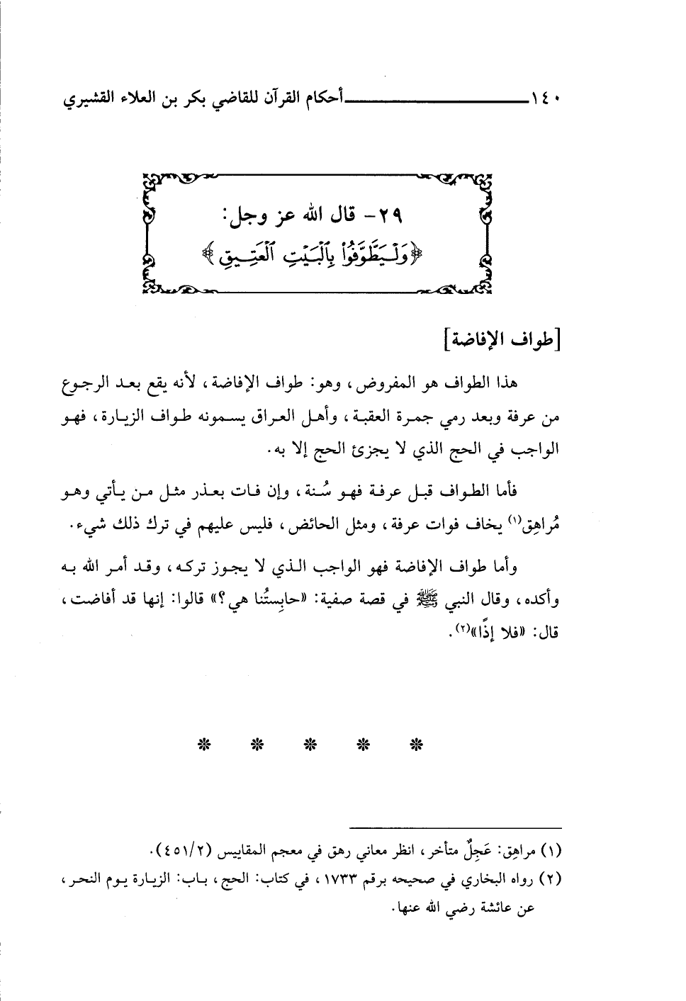 (¬٢) رواه البخاري في صحيحه برقم ١٧٣٣، في كتاب: الحج، باب: الزيارة يوم النحر، عن عائشة رضي اللَّه عنها.