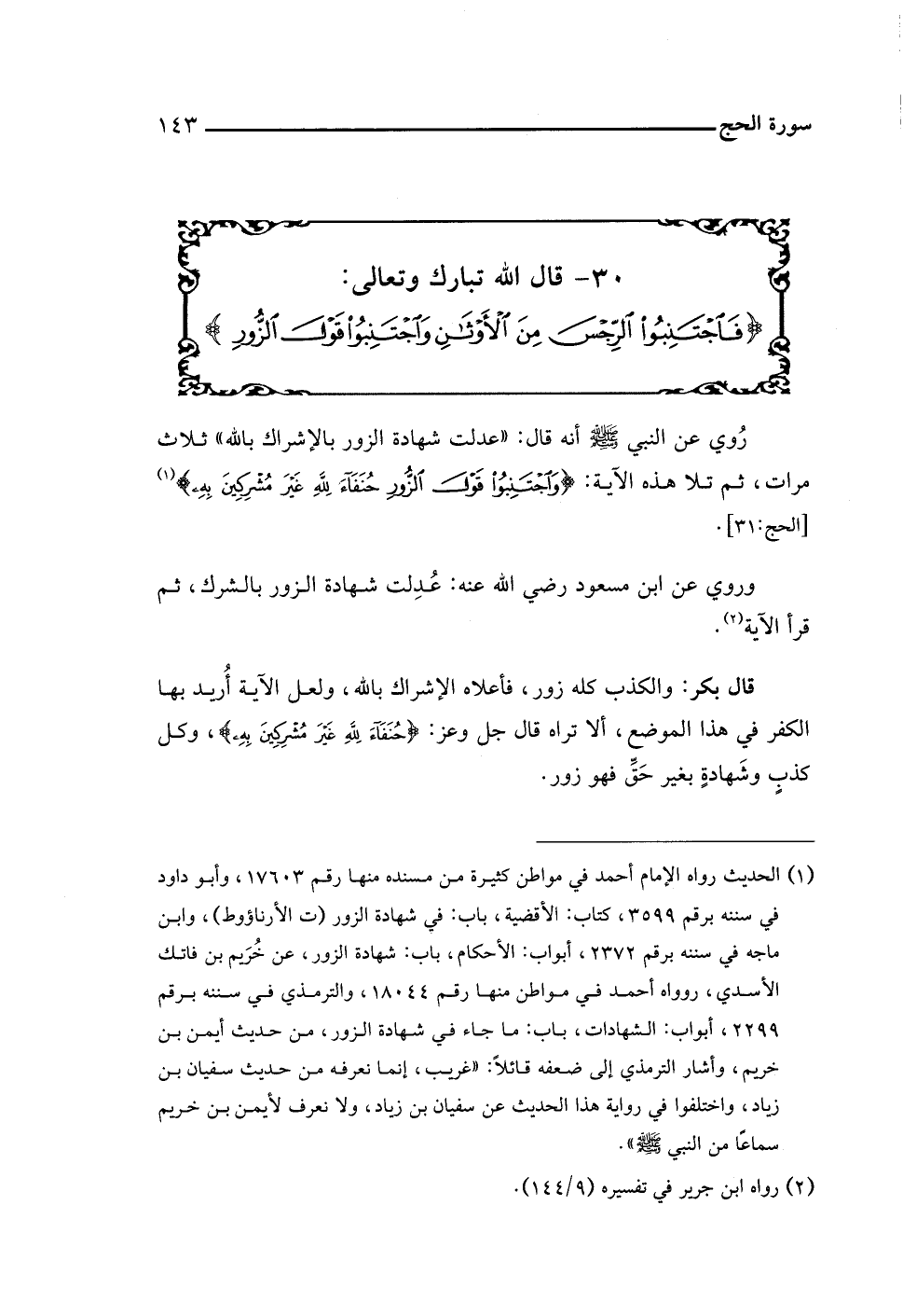 ٣٠ - قال اللَّه تبارك وتعالى: {فَاجْتَنِبُوا الرِّجْسَ مِنَ الْأَوْثَانِ وَاجْتَنِبُوا قَوْلَ الزُّورِ}