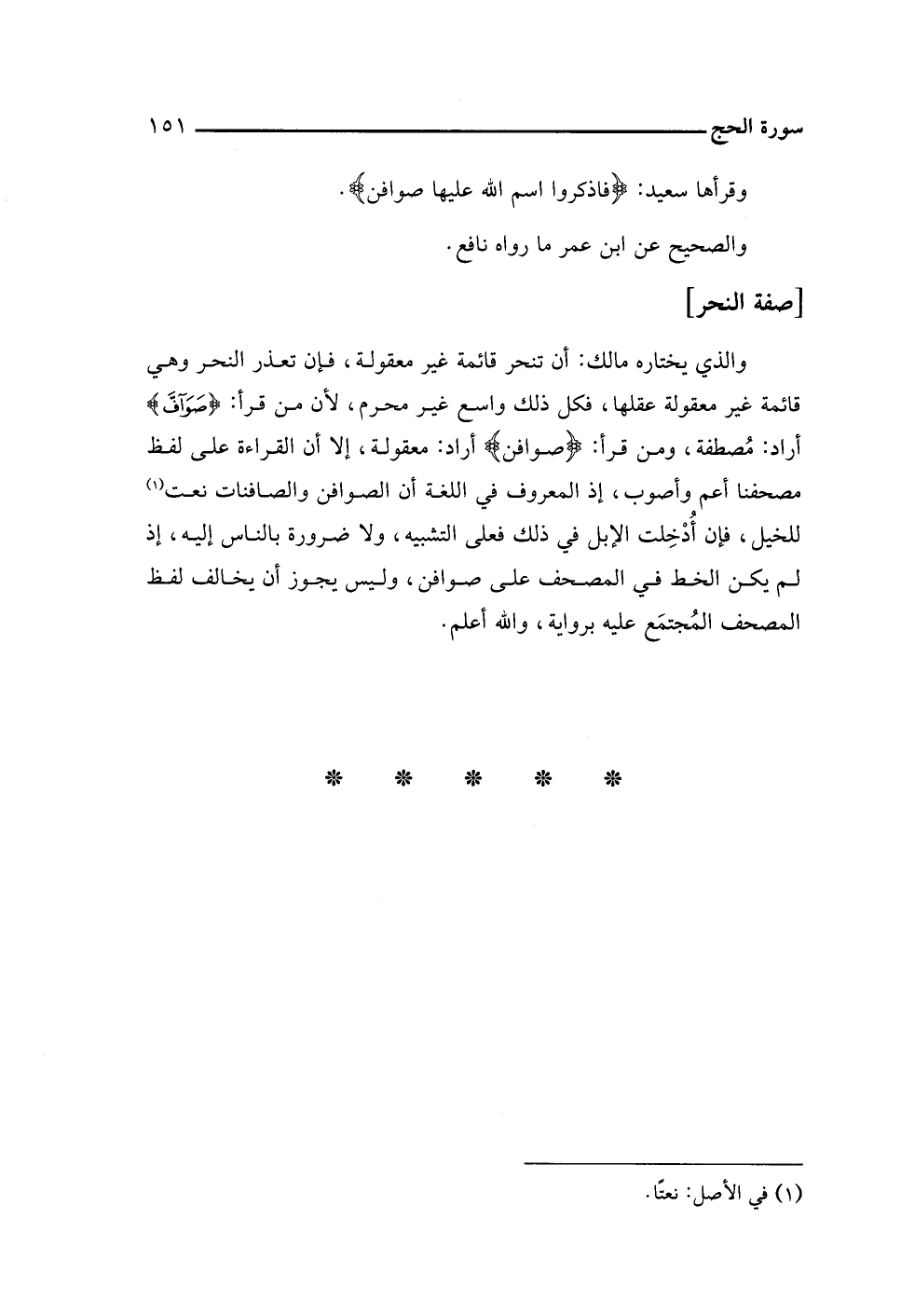 والذي يختاره مالك: أن تنحر قائمة غير معقولة، فإن تعذر النحر وهي قائمة غير معقولة عقلها، فكل ذلك واسع غير محرم، لأن من قرأ: {صَوَافَّ} أراد: مُصطفة، ومن قرأ: {صوافن} أراد: معقولة، إلا أن القراءة على لفظ مصحفنا أعم وأصوب، إذ المعروف في اللغة أن الصوافن والصافنات نعت (¬١) للخيل، فإن أُدْخِلت الإبل في ذلك فعلى التشبيه، ولا ضرورة بالناس إليه، إذ لم يكن الخط في المصحف على صوافن، وليس يجوز أن يخالف لفظ المصحف المُجتمَع عليه برواية، واللَّه أعلم.
