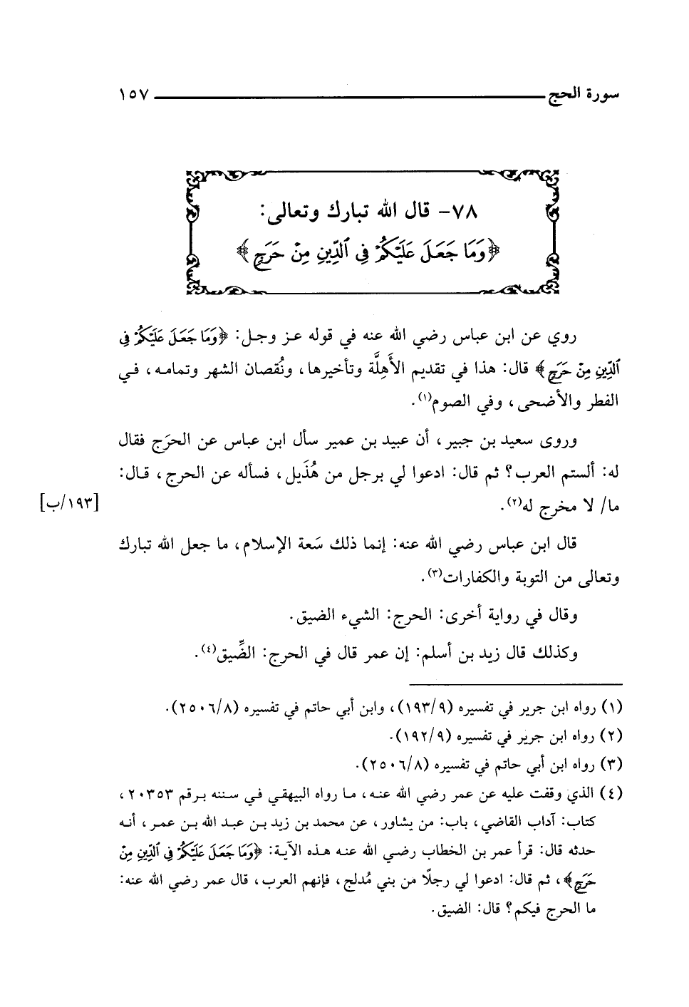 (¬٤) الذي وقفت عليه عن عمر رضي اللَّه عنه، ما رواه البيهقي في سننه برقم ٢٠٣٥٣، كتاب: آداب القاضي، باب: من يشاور، عن محمد بن زيد بن عبد اللَّه بن عمر، أنه حدثه قال: قرأ عمر بن الخطاب رضي اللَّه عنه هذه الآية: {وَمَا جَعَلَ عَلَيْكُمْ فِي الدِّينِ مِنْ حَرَجٍ}، ثم قال: ادعوا لي رجلًا من بني مُدلج، فإنهم العرب، قال عمر رضي اللَّه عنه: ما الحرج فيكم؟ قال: الضيق.