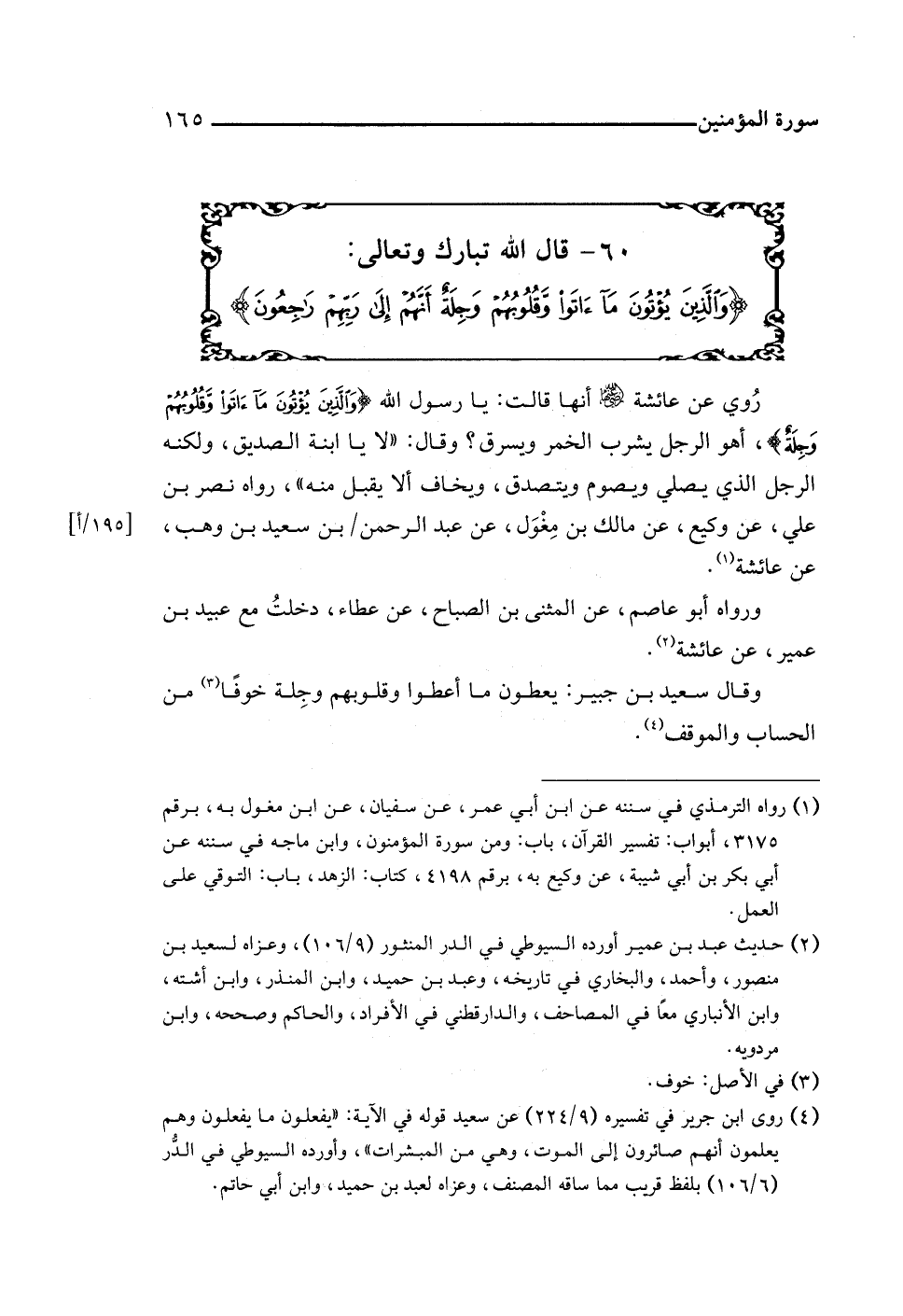 (¬١) رواه الترمذي في سننه عن ابن أبي عمر، عن سفيان، عن ابن مغول به، برقم ٣١٧٥، أبواب: تفسير القرآن، باب: ومن سورة المؤمنون، وابن ماجه في سننه عن أبي بكر بن أبي شيبة، عن وكيع به، برقم ٤١٩٨، كتاب: الزهد، باب: التوقي على العمل.