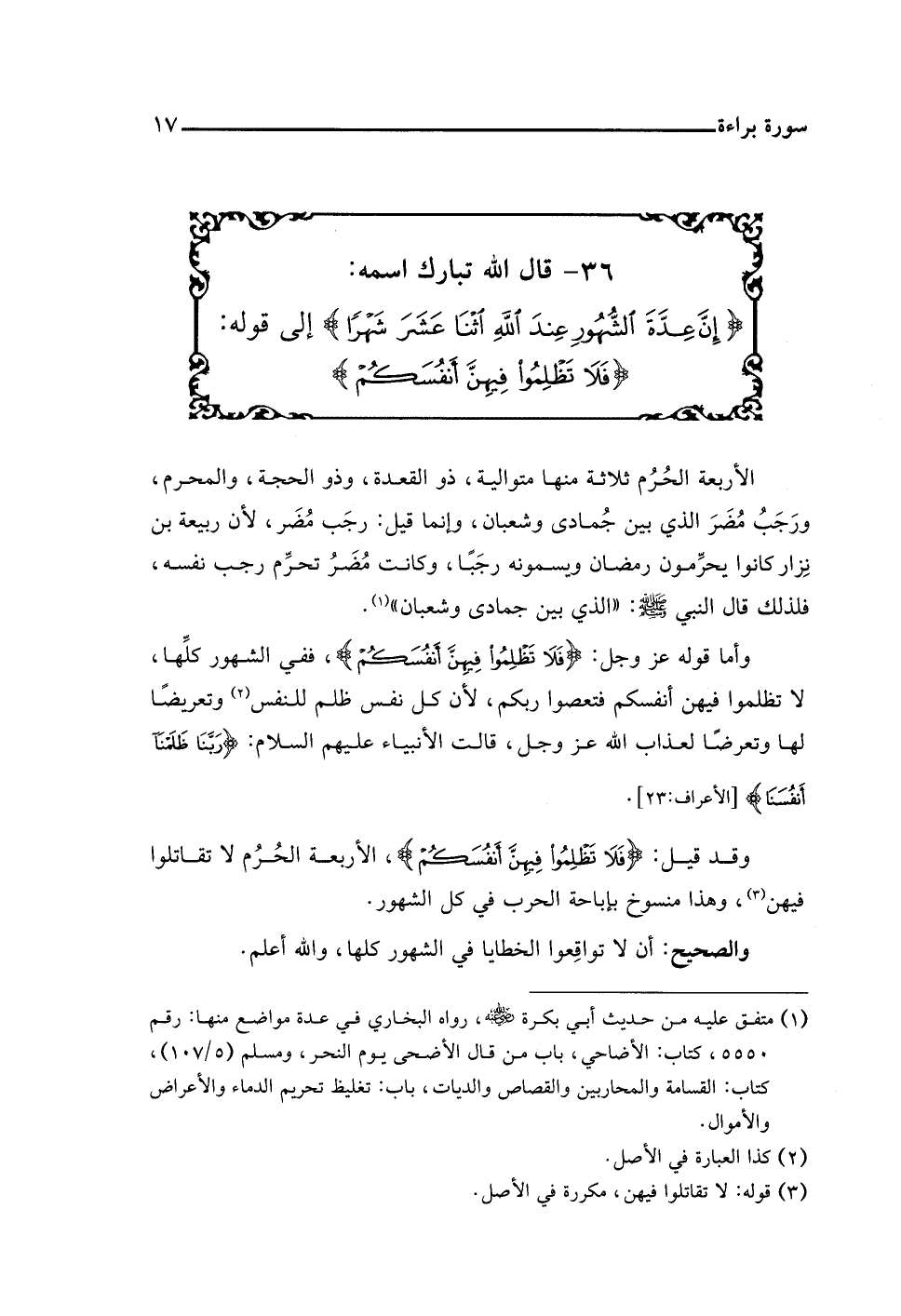 ٣٦ - قال اللَّه تبارك اسمه: {إِنَّ عِدَّةَ الشُّهُورِ عِنْدَ اللَّهِ اثْنَا عَشَرَ شَهْرًا} إلى قوله: {فَلَا تَظْلِمُوا فِيهِنَّ أَنْفُسَكُمْ}