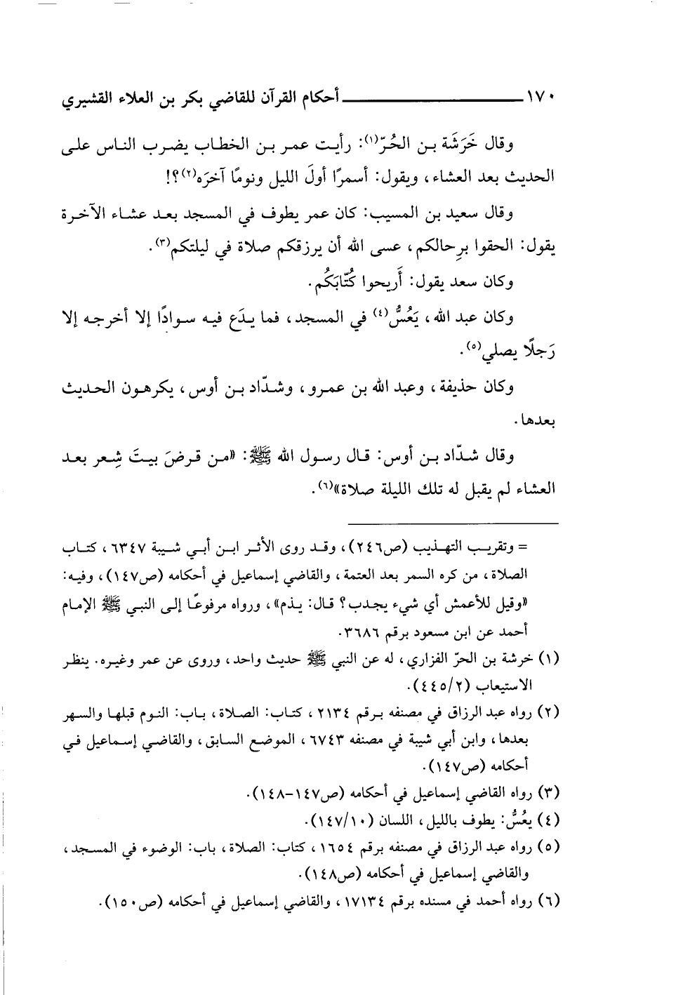 (¬٢) رواه عبد الرزاق في مصنفه برقم ٢١٣٤، كتاب: الصلاة، باب: النوم قبلها والسهر بعدها، وابن أبي شيبة في مصنفه ٦٧٤٣، الموضع السابق، والقاضي إسماعيل في أحكامه (ص ١٤٧).