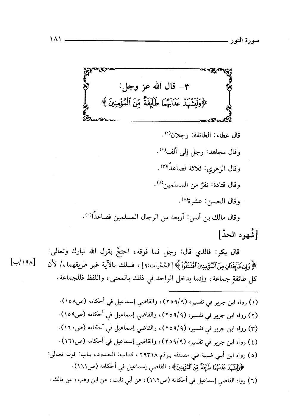 (¬٥) رواه ابن أبي شيبة في مصنفه برقم ٢٩٣١٨، كتاب: الحدود، باب: قوله تعالى: {وَلْيَشْهَدْ عَذَابَهُمَا طَائِفَةٌ مِنَ الْمُؤْمِنِينَ}، القاضي إسماعيل في أحكامه (ص ١٦١).