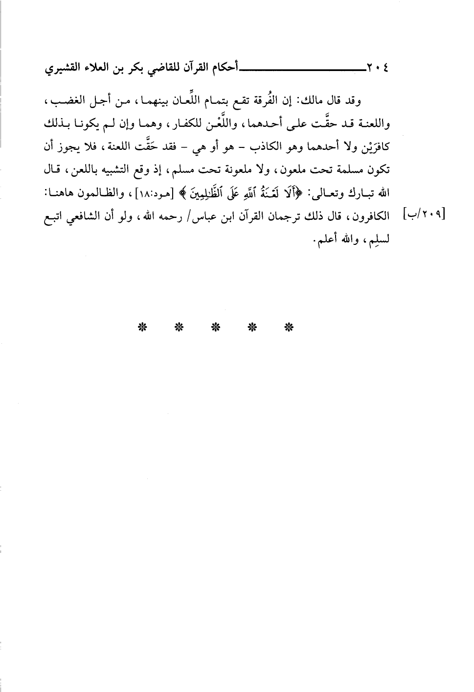 وقد قال مالك: إن الفُرقة تقع بتمام اللِّعان بينهما، من أجل الغضب، واللعنة قد حقَّت على أحدهما، واللَّعْن للكفار، وهما وإن لم يكونا بذلك كافرَيْن ولا أحدهما وهو الكاذب -هو أو هي- فقد حَقَّت اللعنة، فلا يجوز أن تكون مسلمة تحت ملعون، ولا ملعونة تحت مسلم، إذ وقع التشبيه باللعن، قال اللَّه تبارك وتعالى: {أَلَا لَعْنَةُ اللَّهِ عَلَى الظَّالِمِينَ} [هود: ١٨]، والظالمون هاهنا: الكافرون، قال ذلك ترجمان القرآن ابن عباس رحمه اللَّه، ولو أن الشافعي اتبع لسلِم، واللَّه أعلم.