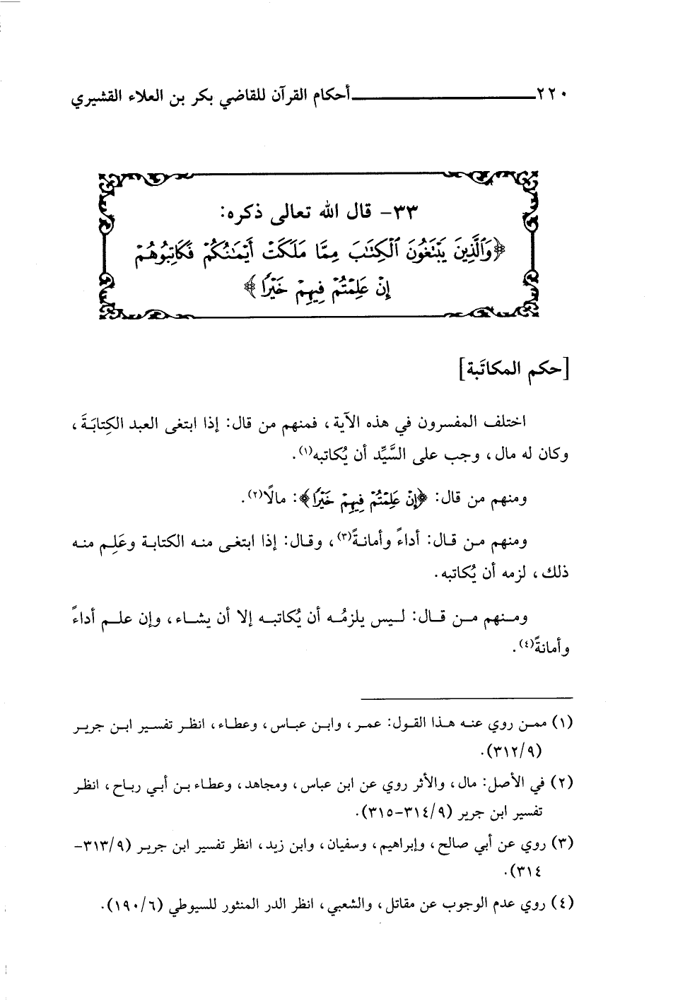٣٣ - قال اللَّه تعالى ذكره: {وَالَّذِينَ يَبْتَغُونَ الْكِتَابَ مِمَّا مَلَكَتْ أَيْمَانُكُمْ فَكَاتِبُوهُمْ إِنْ عَلِمْتُمْ فِيهِمْ خَيْرًا}