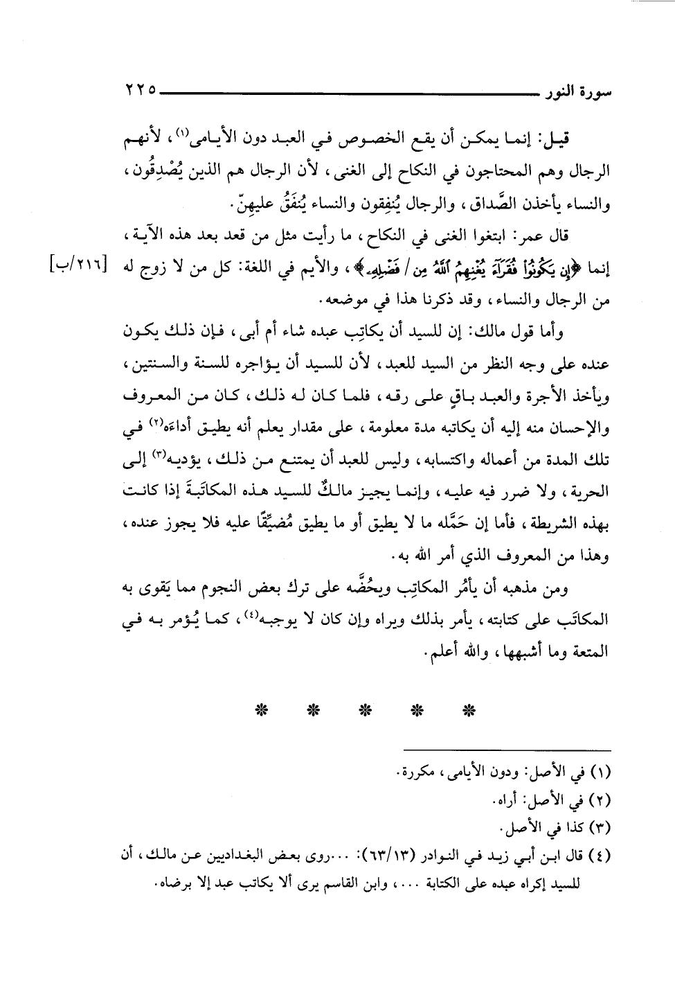 (¬٤) قال ابن أبي زيد في النوادر (١٣/ ٦٣): . . . روى بعض البغداديين عن مالك، أن للسيد إكراه عبده على الكتابة. . .، وابن القاسم يرى ألا يكاتب عبد إلا برضاه.