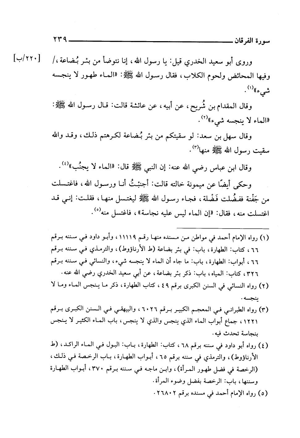 (¬١) رواه الإمام أحمد في مواطن من مسنده منها رقم ١١١١٩، وأبو داود في سننه برقم ٦٦، كتاب: الطهارة، باب: في بئر بضاعة (ط الأرناؤوط)، والترمذي في سننه برقم ٦٦، أبواب: الطهارة، باب: ما جاء أن الماء لا ينجسه شيء، والنسائي في سننه برقم ٣٢٦، كتاب: المياه، باب: ذكر بئر بضاعة، عن أبي سعيد الخدري رضي اللَّه عنه.