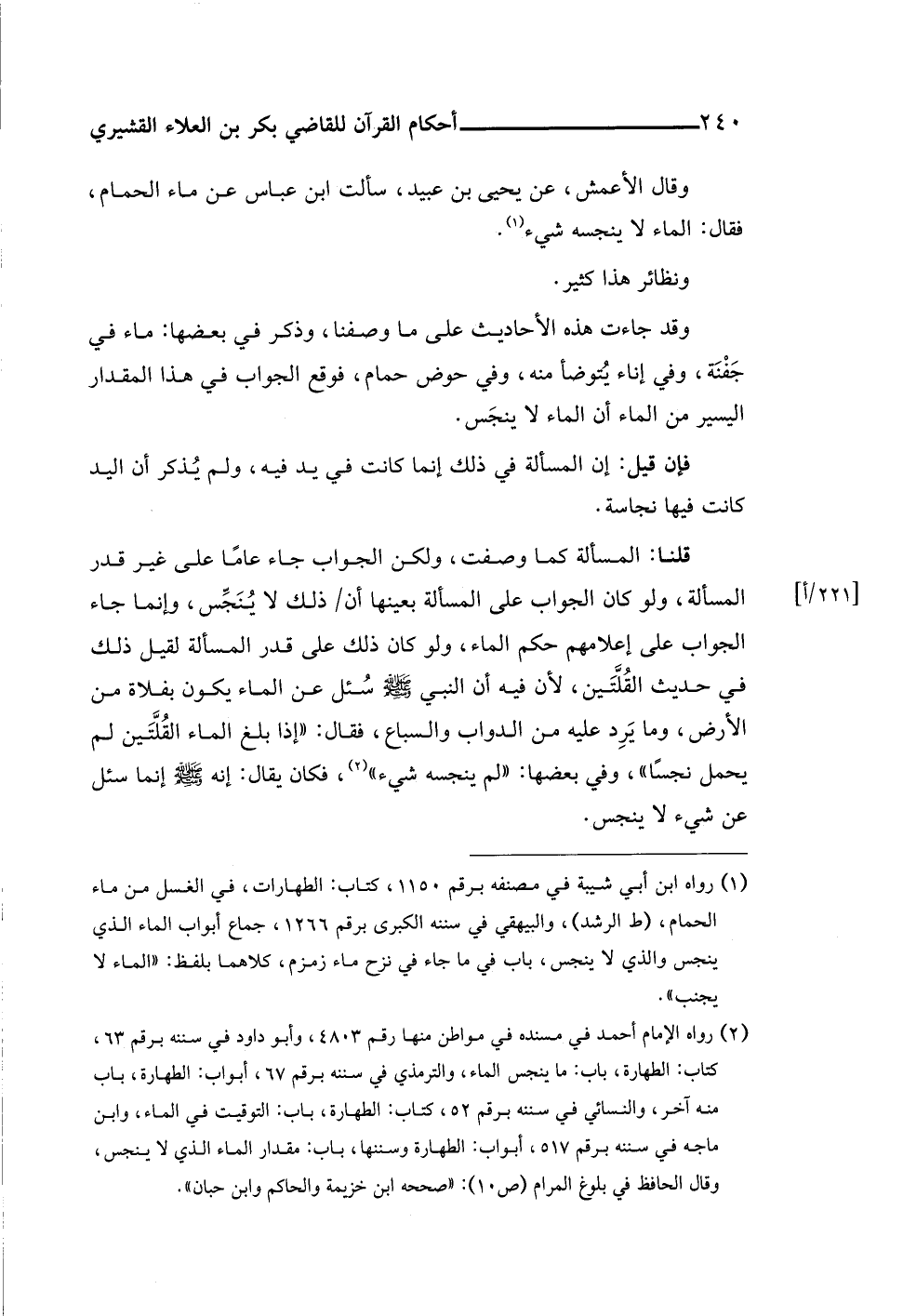 (¬٢) رواه الإمام أحمد في مسنده في مواطن منها رقم ٤٨٠٣، وأبو داود في سننه برقم ٦٣، كتاب: الطهارة، باب: ما ينجس الماء، والترمذي في سننه برقم ٦٧، أبواب: الطهارة، باب منه آخر، والنسائي في سننه برقم ٥٢، كتاب: الطهارة، باب: التوقيت في الماء، وابن ماجه في سننه برقم ٥١٧، أبواب: الطهارة وسننها، باب: مقدار الماء الذي لا ينجس، وقال الحافظ في بلوغ المرام (ص ١٠): "صححه ابن خزيمة والحاكم وابن حبان".