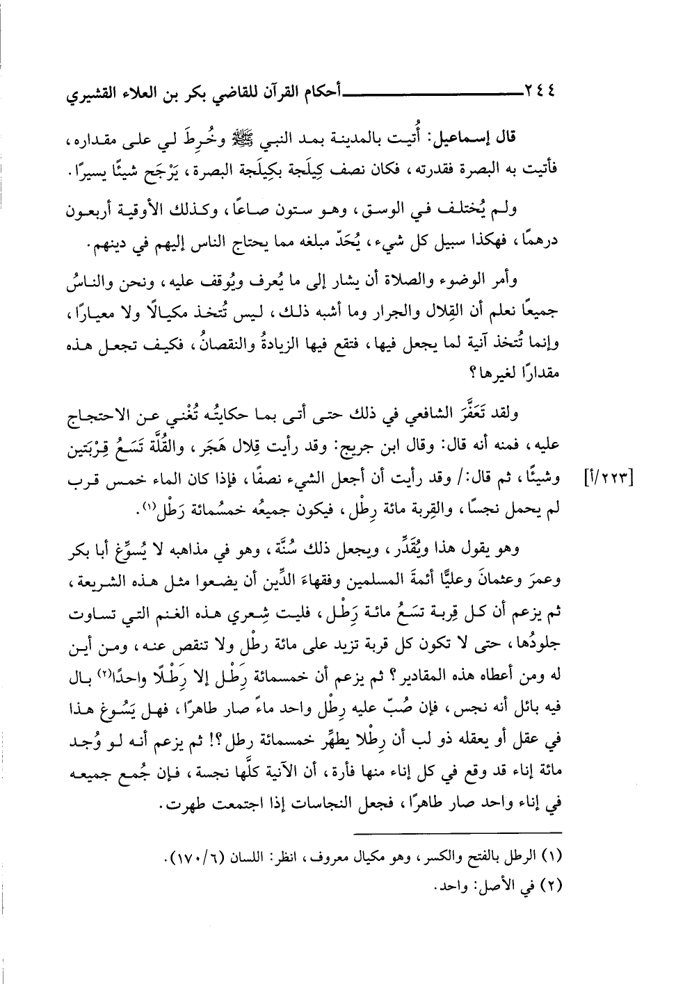 ولقد تَعَفَّرَ الشافعي في ذلك حتى أتى بما حكايتُه تُغْني عن الاحتجاج عليه، فمنه أنه قال: وقال ابن جريج: وقد رأيت قِلال هَجَر، والقُلَّة تَسَعُ قِرْبَتين وشيئًا، ثم قال: وقد رأيت أن أجعل الشيء نصفًا، فإذا كان الماء خمس قرب لم يحمل نجسًا، والقِربة مائة رِطْل، فيكون جميعُه خمسُمائة رَطْل (¬١).
