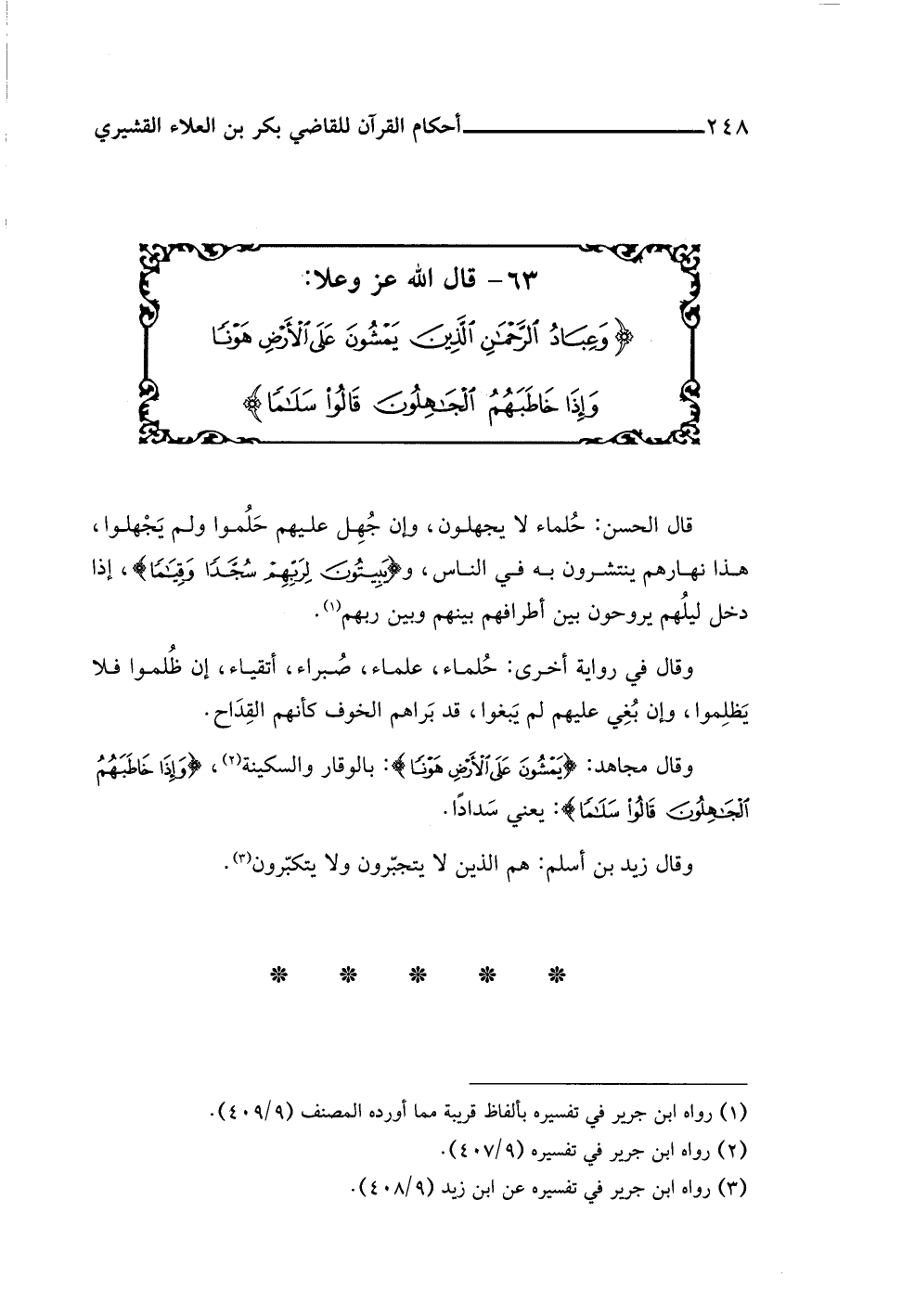 ٦٣ - قال اللَّه عز وعلا: {وَعِبَادُ الرَّحْمَنِ الَّذِينَ يَمْشُونَ عَلَى الْأَرْضِ هَوْنًا وَإِذَا خَاطَبَهُمُ الْجَاهِلُونَ قَالُوا سَلَامًا}
