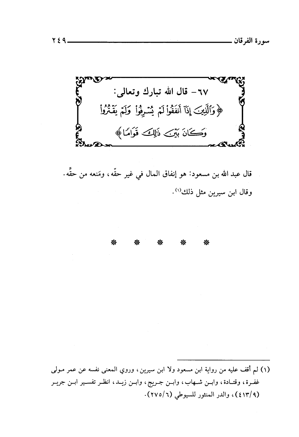 ٦٧ - قال اللَّه تبارك وتعالى: {وَالَّذِينَ إِذَا أَنْفَقُوا لَمْ يُسْرِفُوا وَلَمْ يَقْتُرُوا وَكَانَ بَيْنَ ذَلِكَ قَوَامًا}