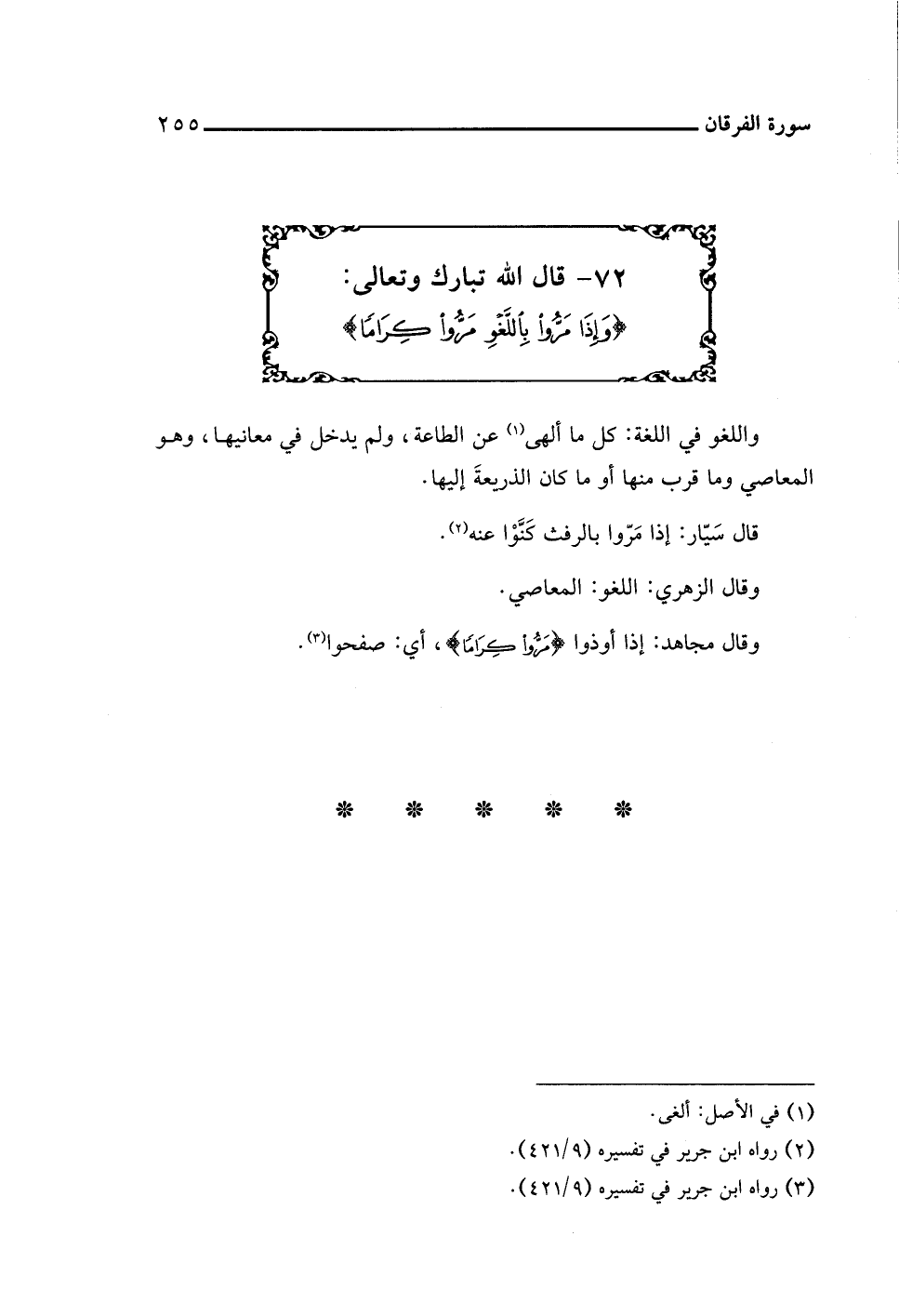 ٧٢ - قال اللَّه تبارك وتعالى: {وَإِذَا مَرُّوا بِاللَّغْوِ مَرُّوا كِرَامًا}
