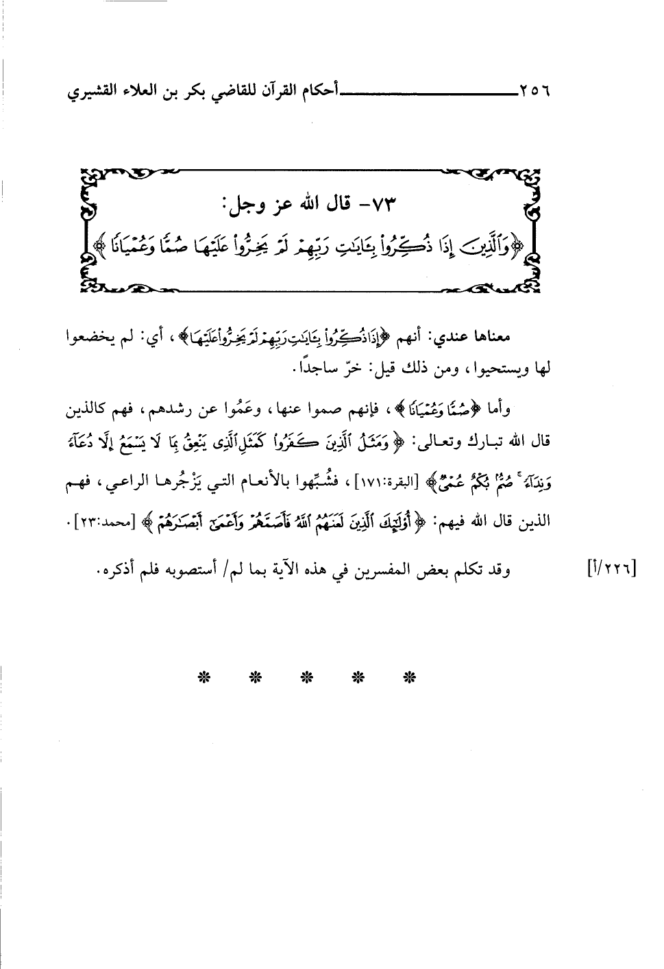 ٧٣ - قال اللَّه عز وجل: {وَالَّذِينَ إِذَا ذُكِّرُوا بِآيَاتِ رَبِّهِمْ لَمْ يَخِرُّوا عَلَيْهَا صُمًّا وَعُمْيَانًا}