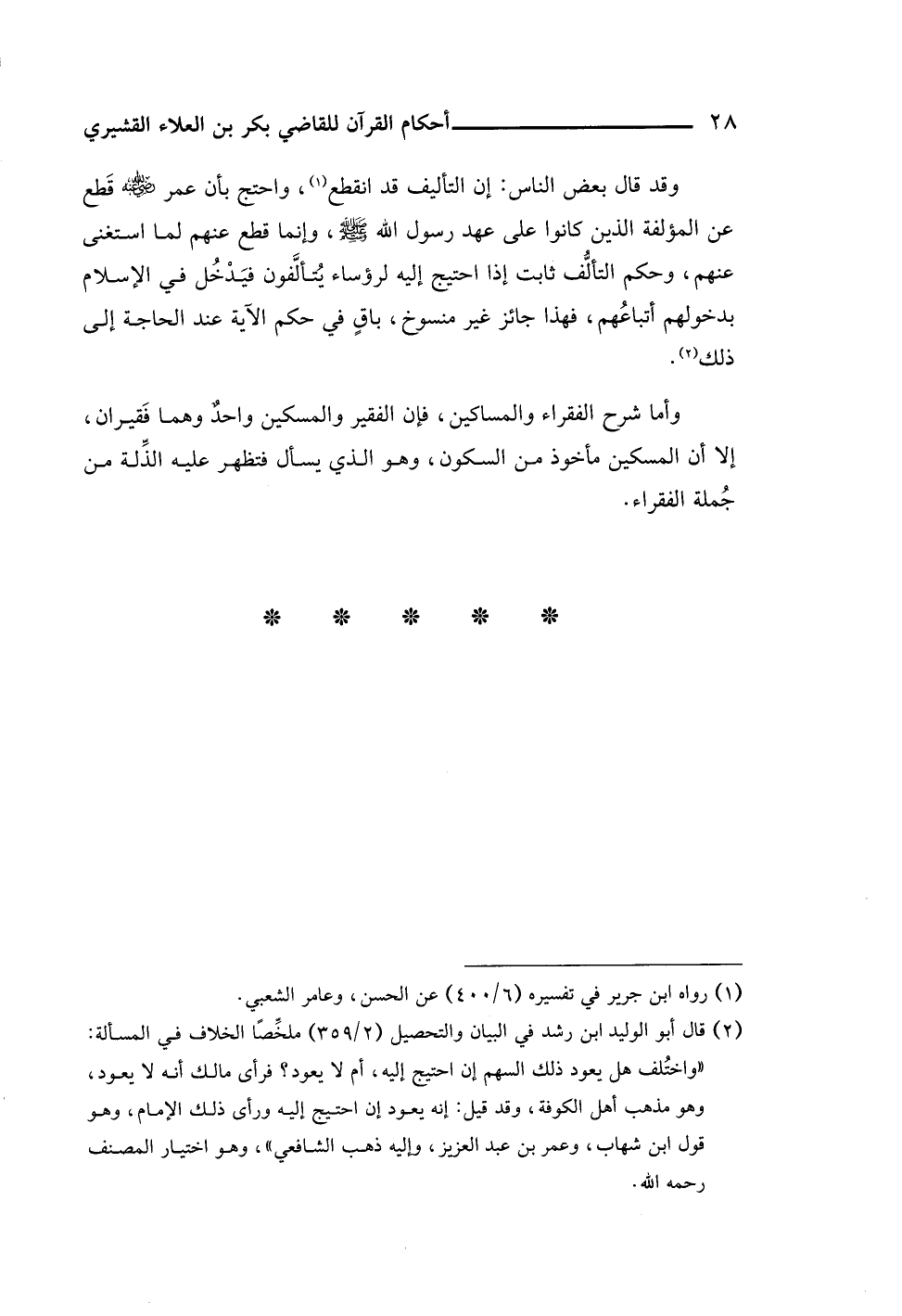 وقد قال بعض الناس: إن التأليف قد انقطع (¬١)، واحتج بأن عمر -رضي اللَّه عنه- قَطع عن المؤلفة الذين كانوا على عهد رسول اللَّه -صلى اللَّه عليه وسلم-، وإنما قطع عنهم لما استغنى عنهم، وحكم التألُّف ثابت إذا احتيج إليه لرؤساء يُتألَّفون فيَدْخُل في الإسلام بدخولهم أتباعُهم، فهذا جائز غير منسوخ، باقٍ في حكم الآية عند الحاجة إلى ذلك (¬٢).