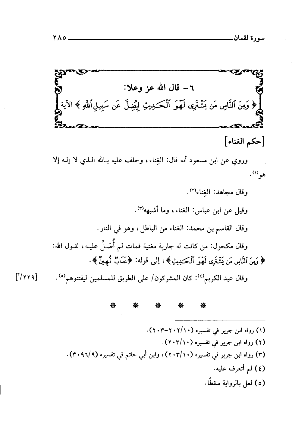 ٦ - قال اللَّه عز وعلا: {وَمِنَ النَّاسِ مَنْ يَشْتَرِي لَهْوَ الْحَدِيثِ لِيُضِلَّ عَنْ سَبِيلِ اللَّهِ} الآية