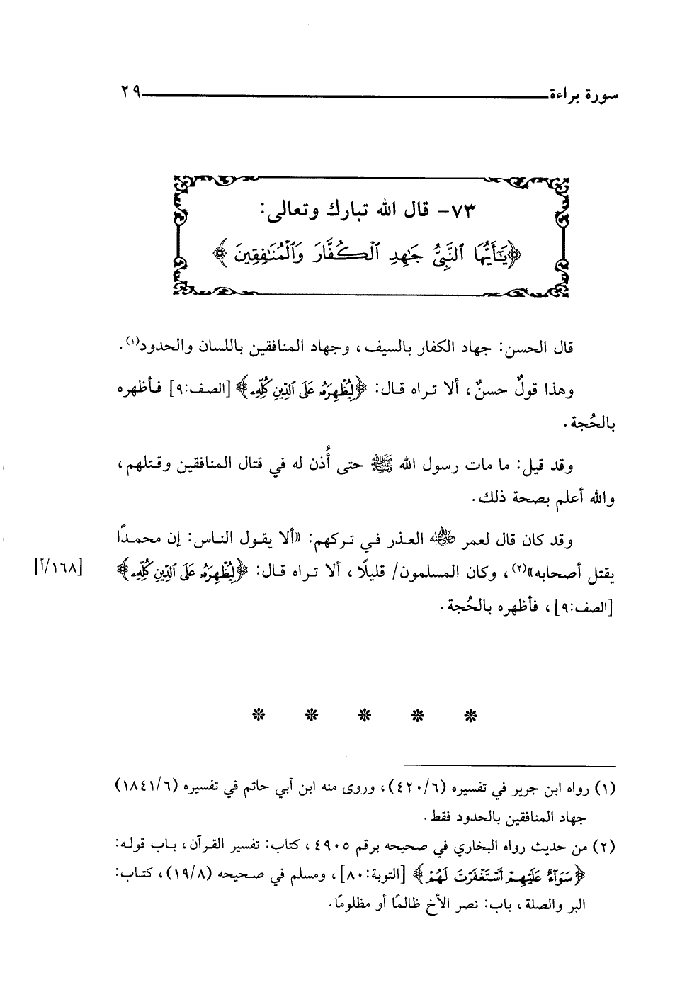٧٣ - قال اللَّه تبارك وتعالى: {يَاأَيُّهَا النَّبِيُّ جَاهِدِ الْكُفَّارَ وَالْمُنَافِقِينَ}