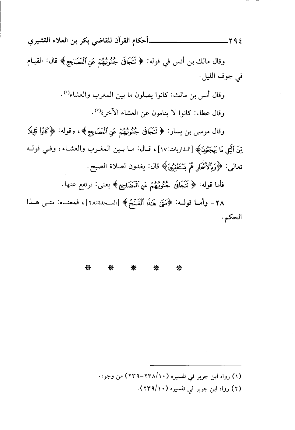 وقال مالك بن أنس في قوله: {تَتَجَافَى جُنُوبُهُمْ عَنِ الْمَضَاجِعِ} قال: القيام في جوف الليل.