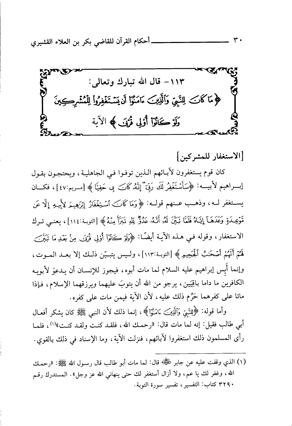 ١١٣ - قال اللَّه تبارك وتعالى: {مَا كَانَ لِلنَّبِيِّ وَالَّذِينَ آمَنُوا أَنْ يَسْتَغْفِرُوا لِلْمُشْرِكِينَ وَلَوْ كَانُوا أُولِي قُرْبَى} الآية