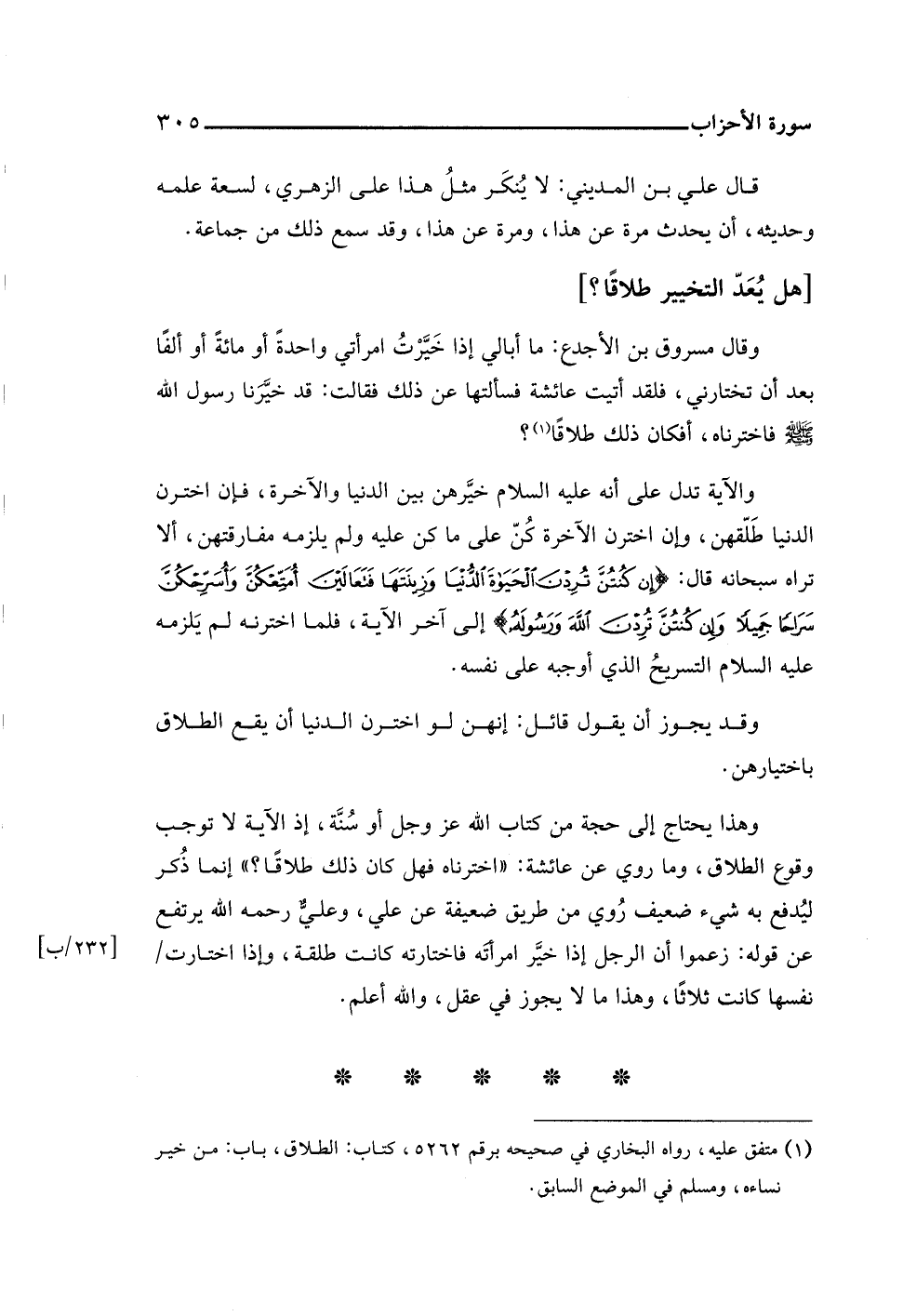 وقال مسروق بن الأجدع: ما أبالي إذا خَيَّرْتُ امرأتي واحدةً أو مائةً أو ألفًا بعد أن تختارني، فلقد أتيت عائشة فسألتها عن ذلك فقالت: قد خيَّرَنا رسول اللَّه -صلى اللَّه عليه وسلم- فاخترناه، أفكان ذلك طلاقًا (¬١)؟