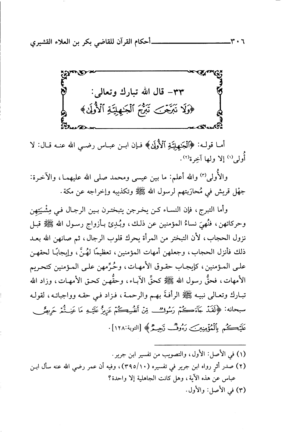 ٣٣ - قال اللَّه تبارك وتعالى: {وَلَا تَبَرَّجْنَ تَبَرُّجَ الْجَاهِلِيَّةِ الْأُولَى}